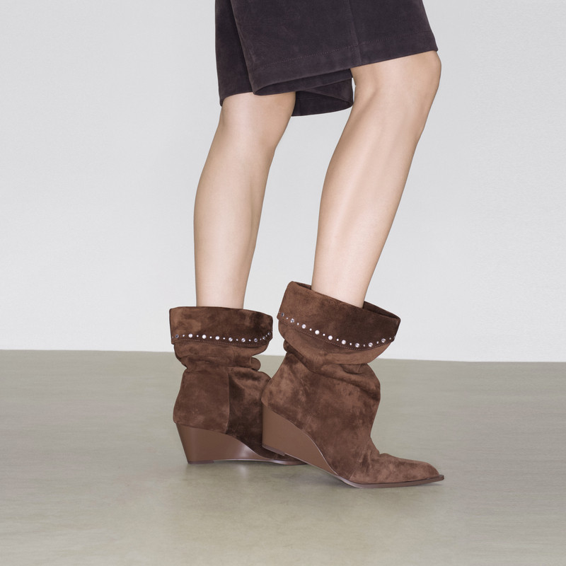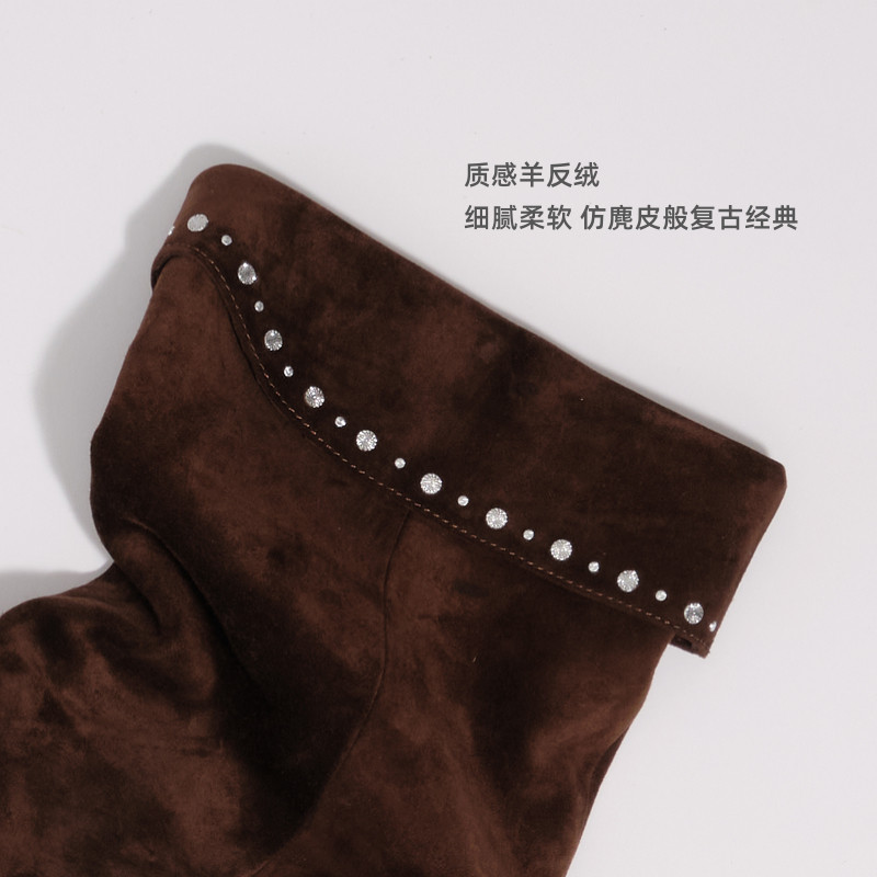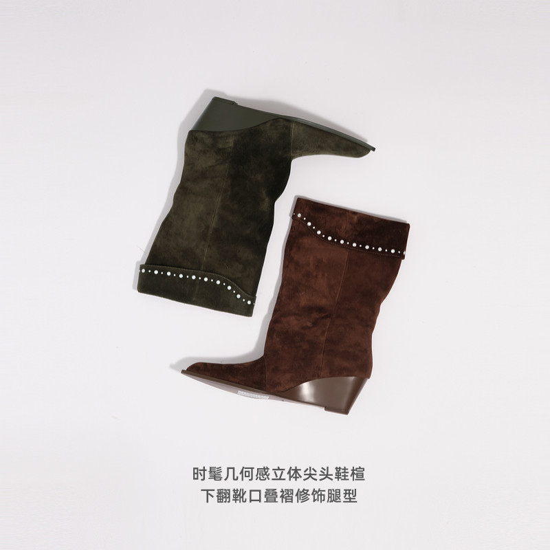 尖头坡跟堆堆靴 波西米亚烫钻复古羊反绒