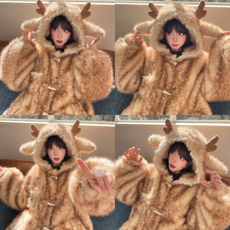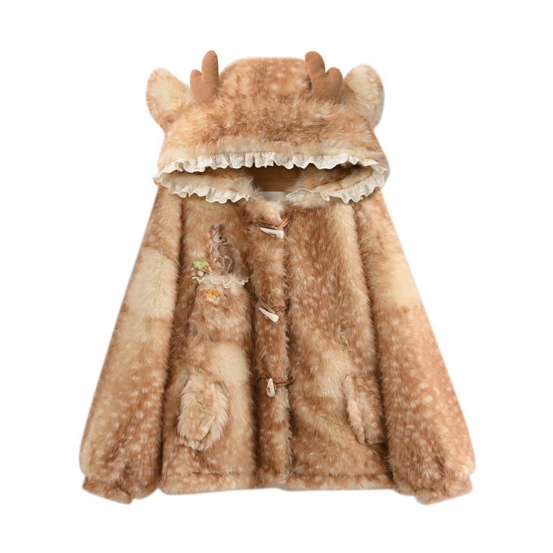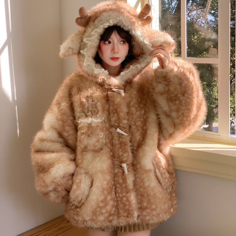森女部落可爱小鹿环保皮草女冬新款小个子加厚羊羔绒毛茸茸厚外套