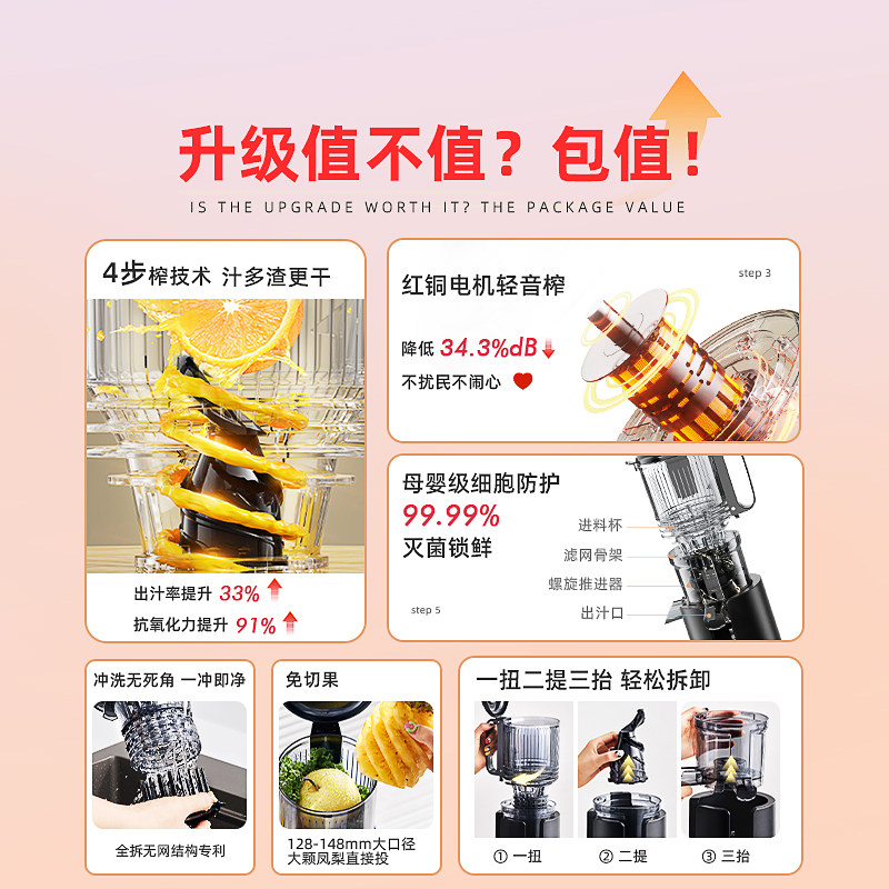 【升级不锈钢压榨】MOKKOM磨客M7原汁机渣汁分离榨汁机家用全自动