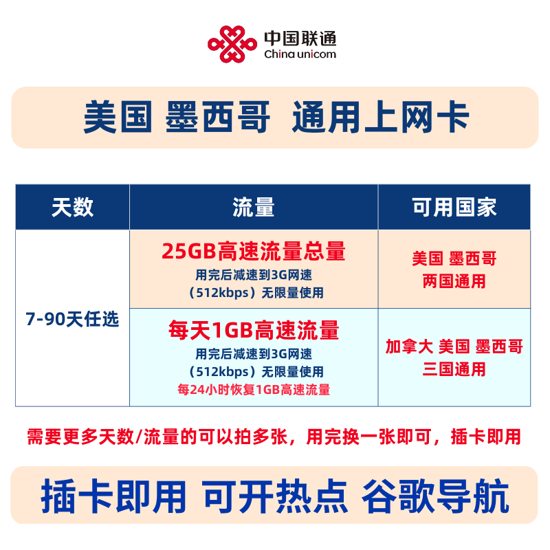 插卡即用,需2026-12-31前激活,激活后开始计时,送转换插头 兼容iPhone/安卓旗舰机,需近3年内手机,不兼容中低端/老旧安卓机 AT&T高速网络,流量用完降速512kbps不限量,支持热点 适用于美国、墨西哥,无通话短信功能,不支持注册/收验证码 去领券购买 ->