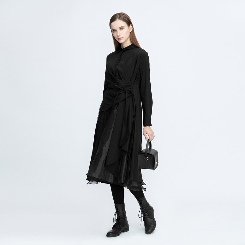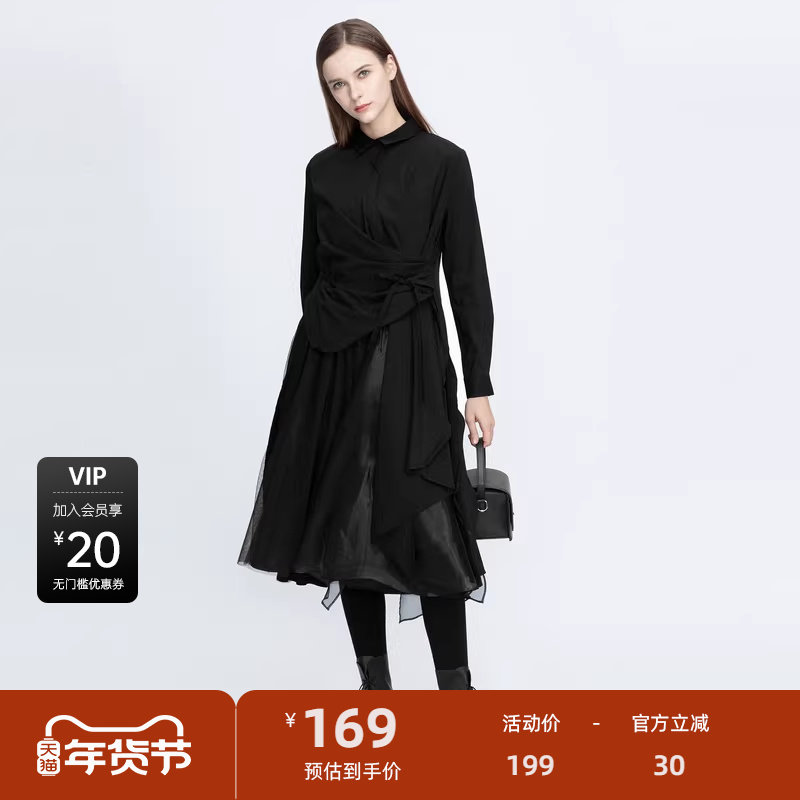 【秒杀】sdeer圣迪奥女装翻领堆叠收腰网纱吊带连衣裙S20481204