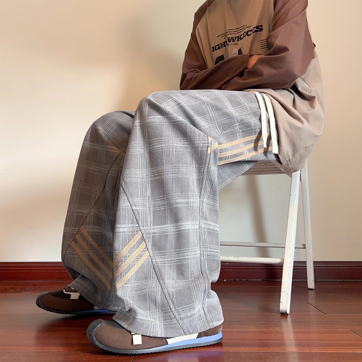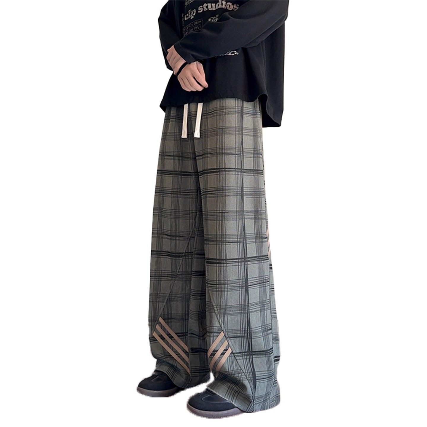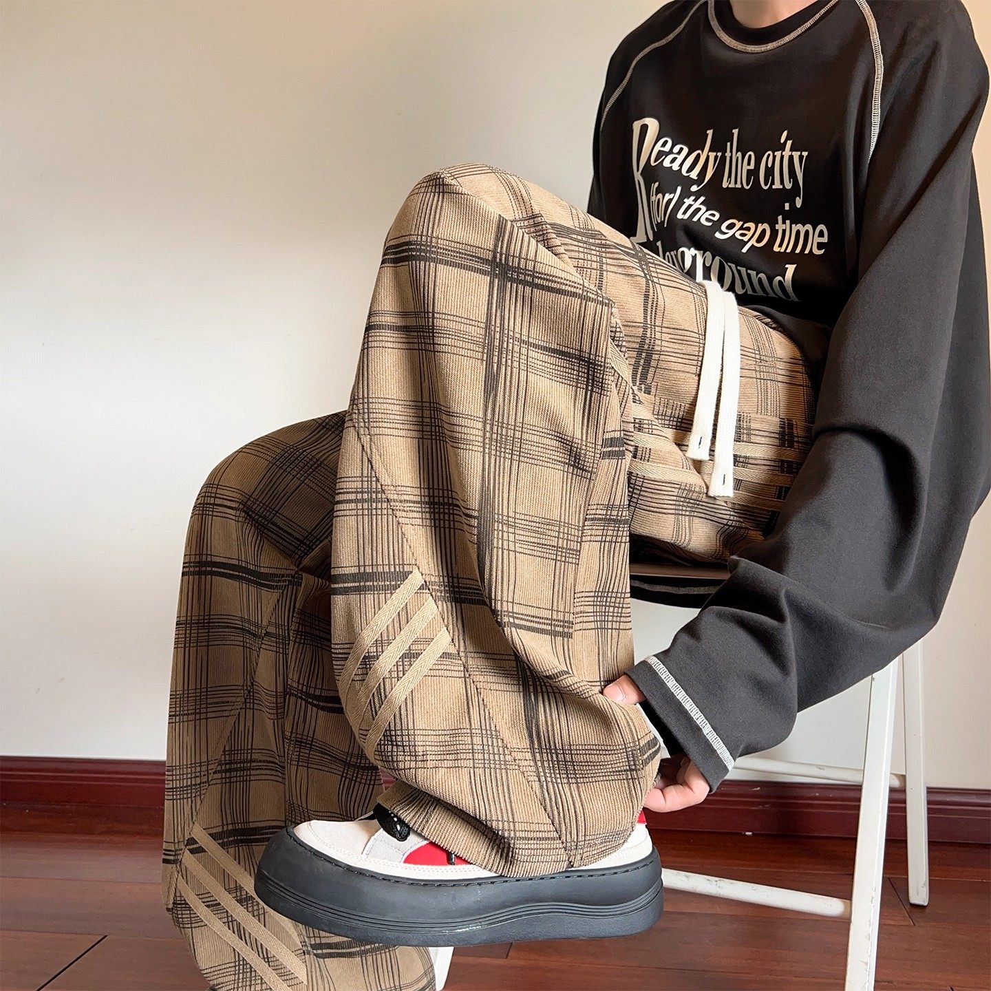 灯芯绒条纹加绒格子裤女秋冬美式休闲裤子宽松直筒大码阔腿运动裤