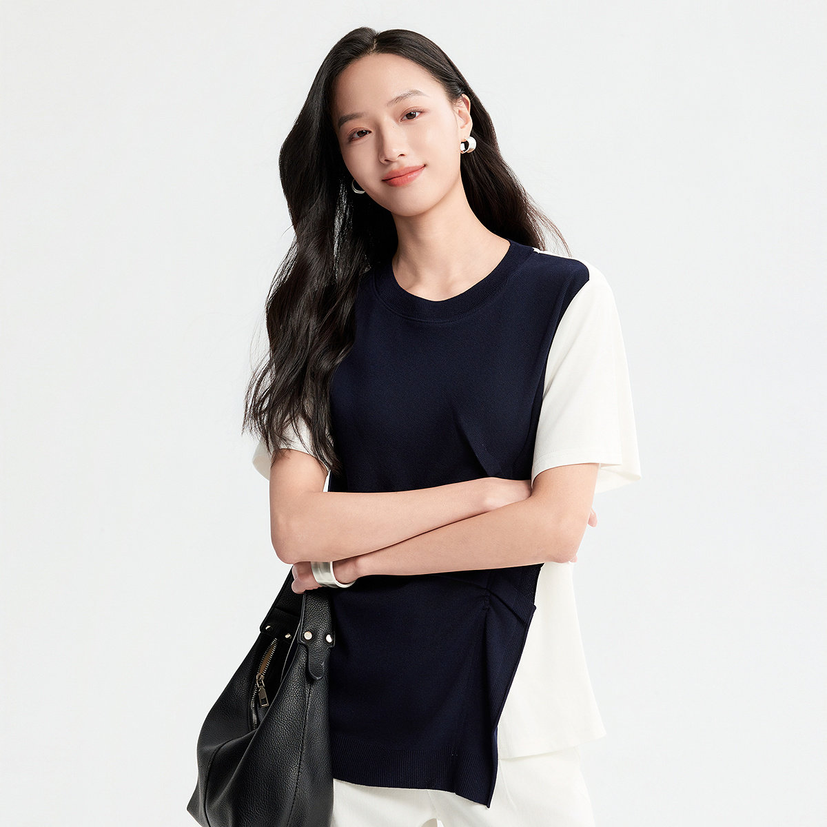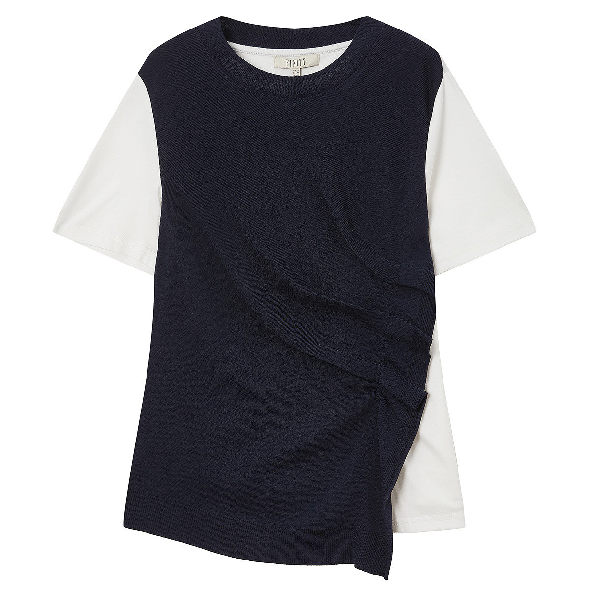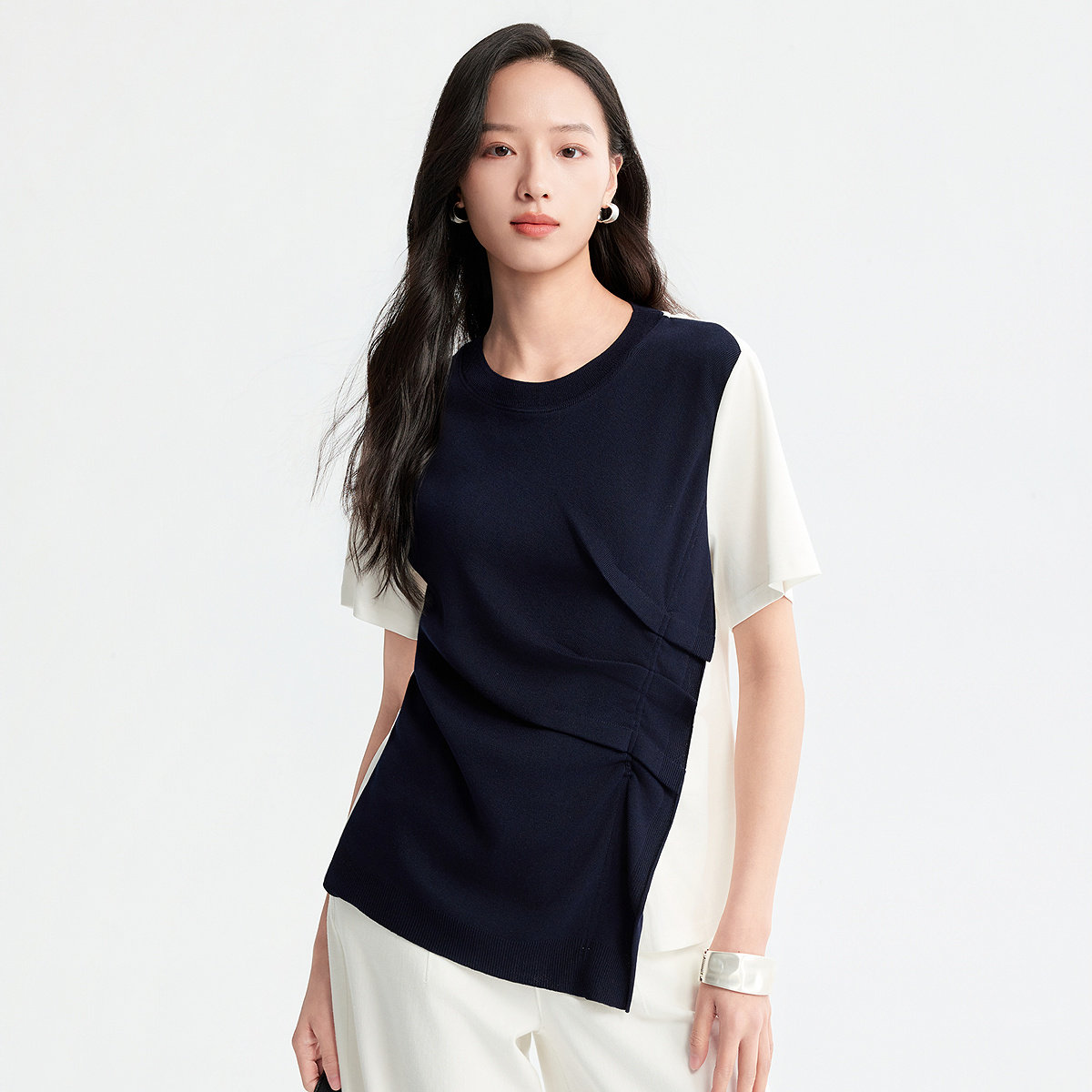 FINITY菲妮迪雪纺衫2026年夏季新款简约蓝白撞色圆领短袖上衣女装