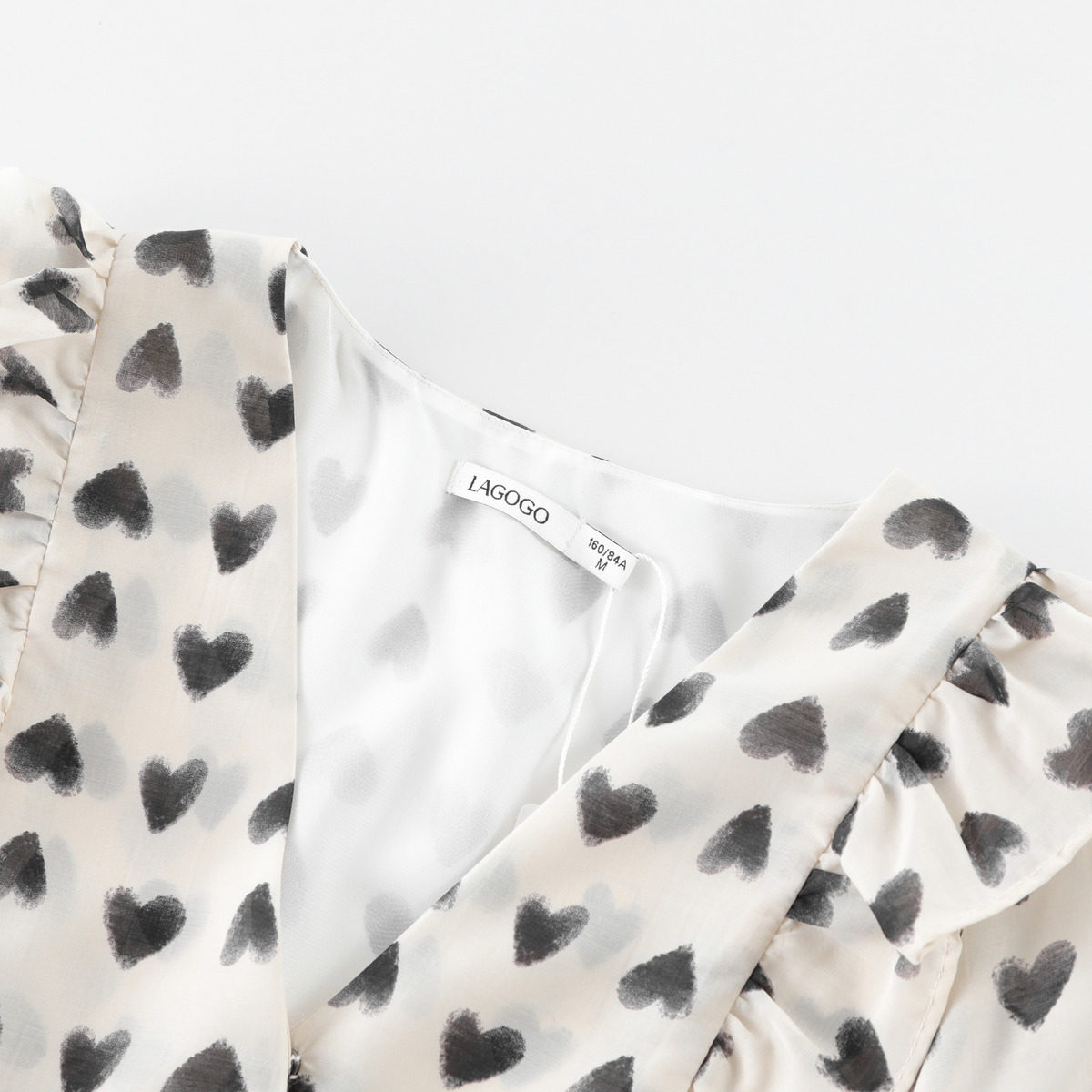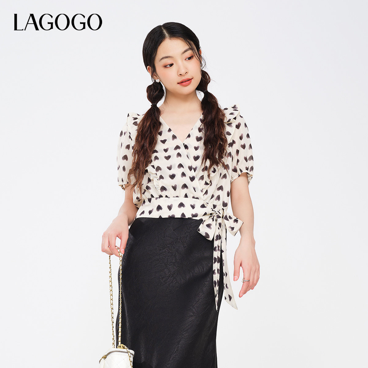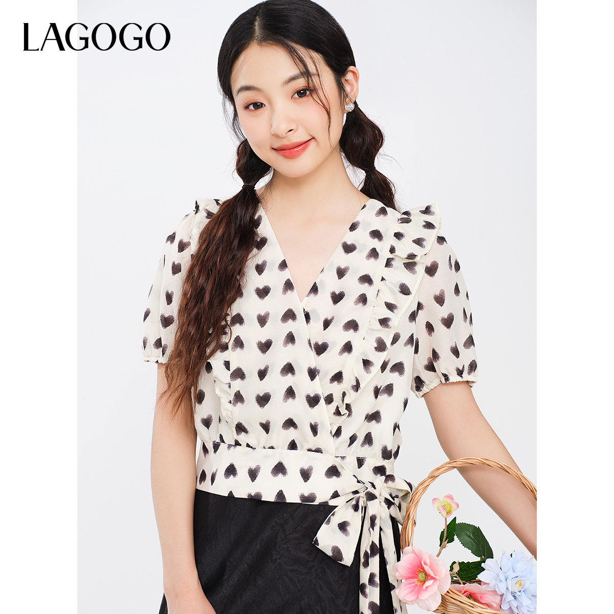 LAGOGO设计感雪纺衫女拉谷谷夏季新款荷叶边v领印花修身复古短袖