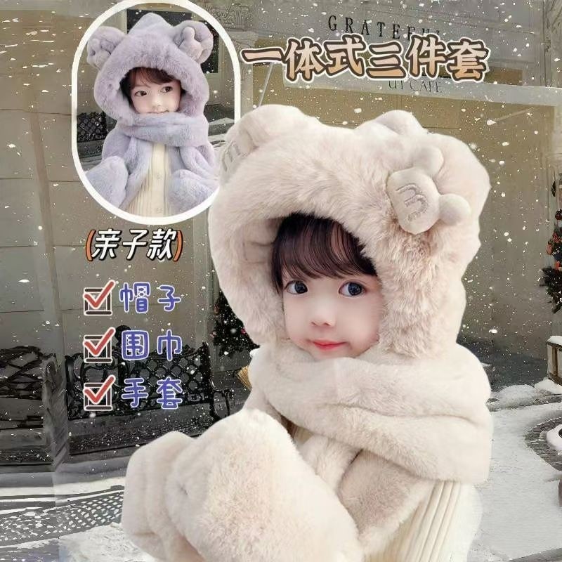 儿童帽子围巾手套三件套冬季加绒加厚女童一体男宝骑车防风帽亲子