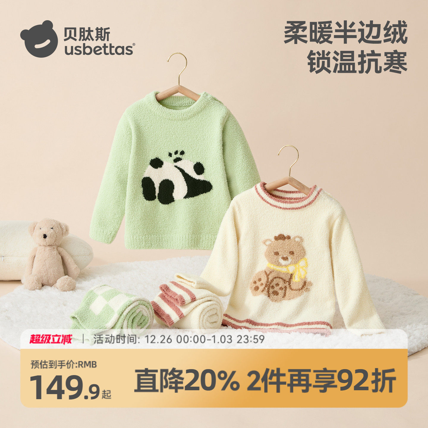 贝肽斯儿童睡衣秋冬款加厚保暖半边绒2025新款亲子宝宝家居服套装
