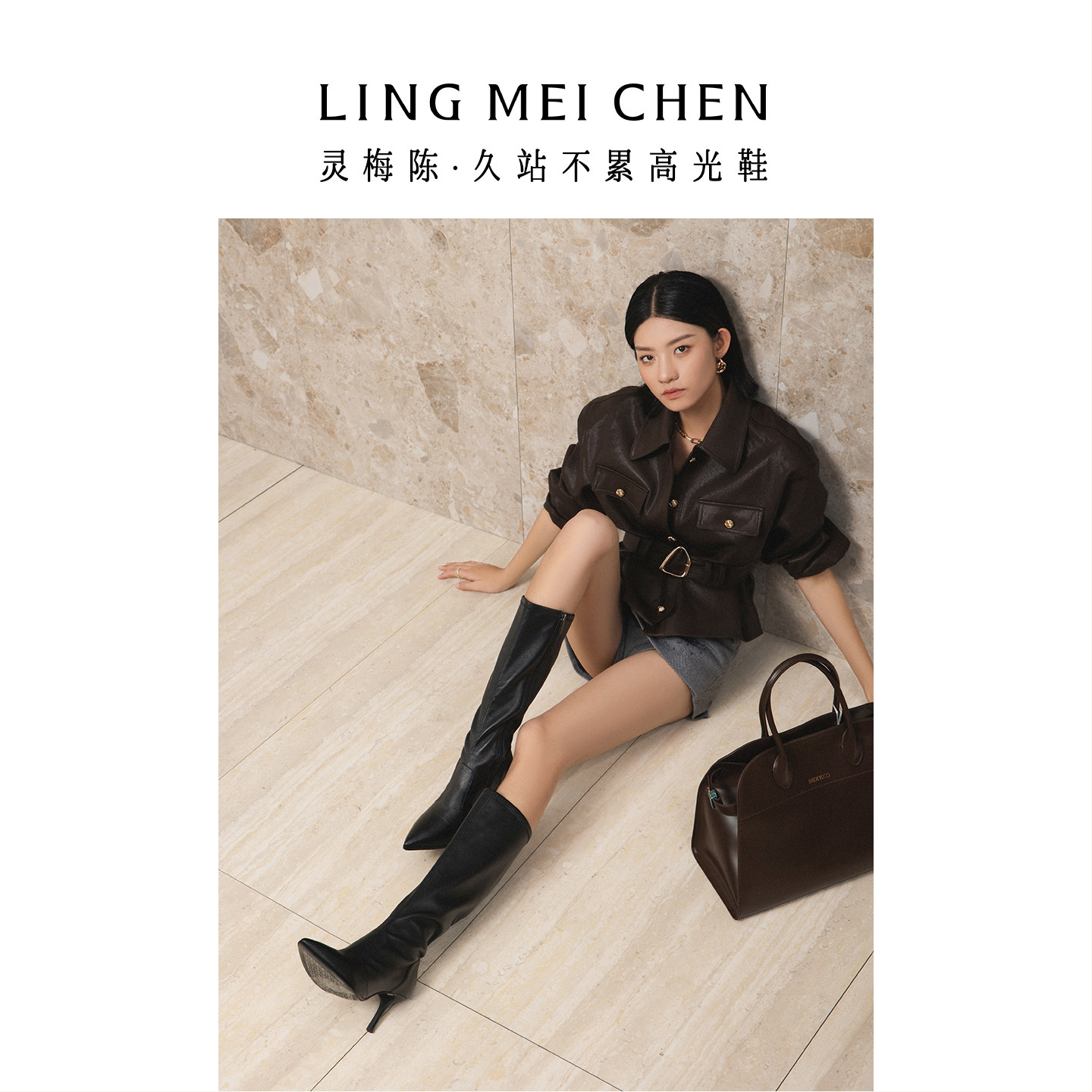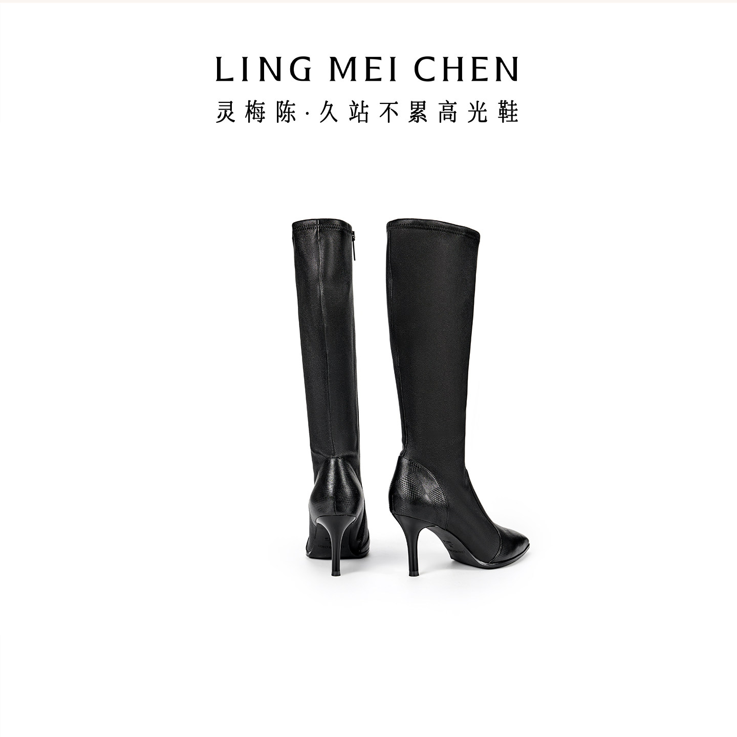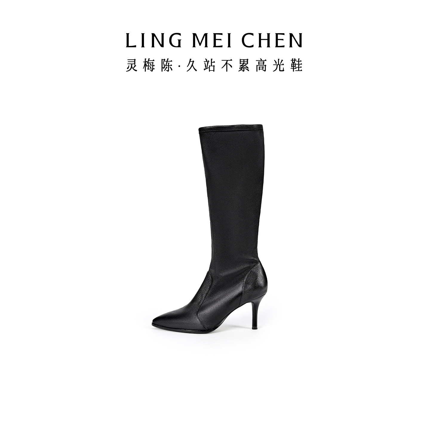 LINGMEICHEN长筒靴袜靴羊皮弹力靴高跟长靴新款尖头高跟鞋靴子女