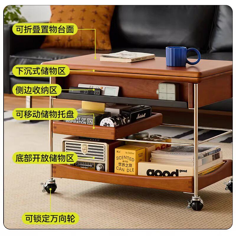 实木茶几家用客厅小推车中古风小户型可移动折叠茶几沙发边几高级