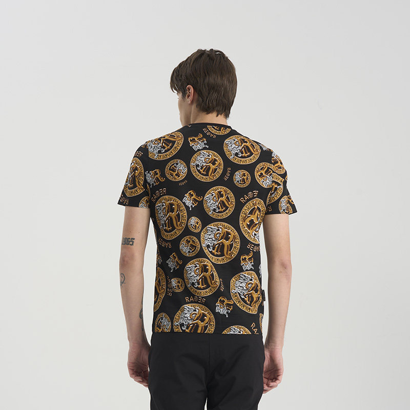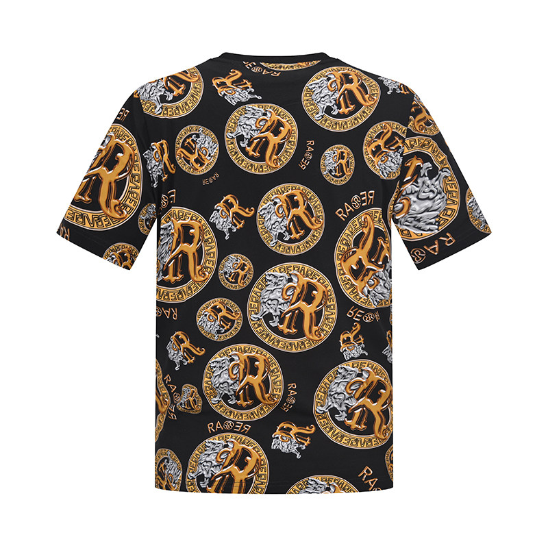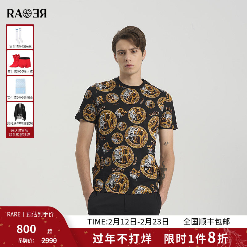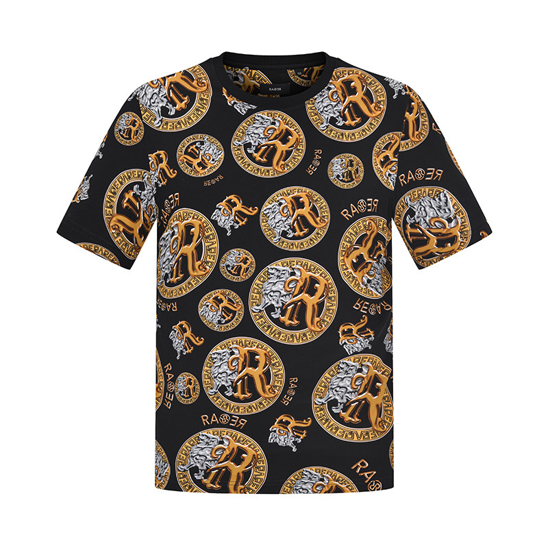 RARE威雅男装夏季新款满版金属飞狮印花黑色圆领T恤修身短袖