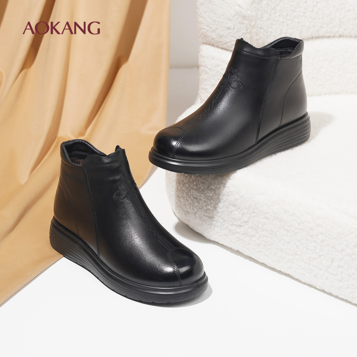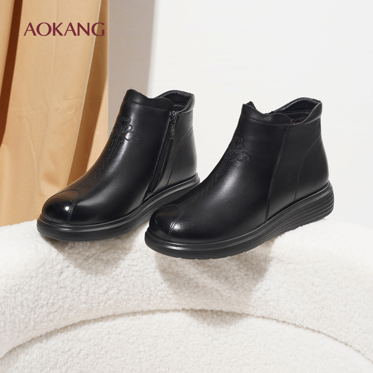 奥康 女鞋2025冬季新款女棉鞋加绒保暖休闲妈妈鞋时尚简约短靴L