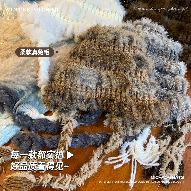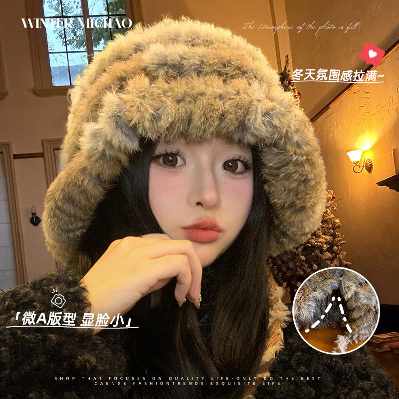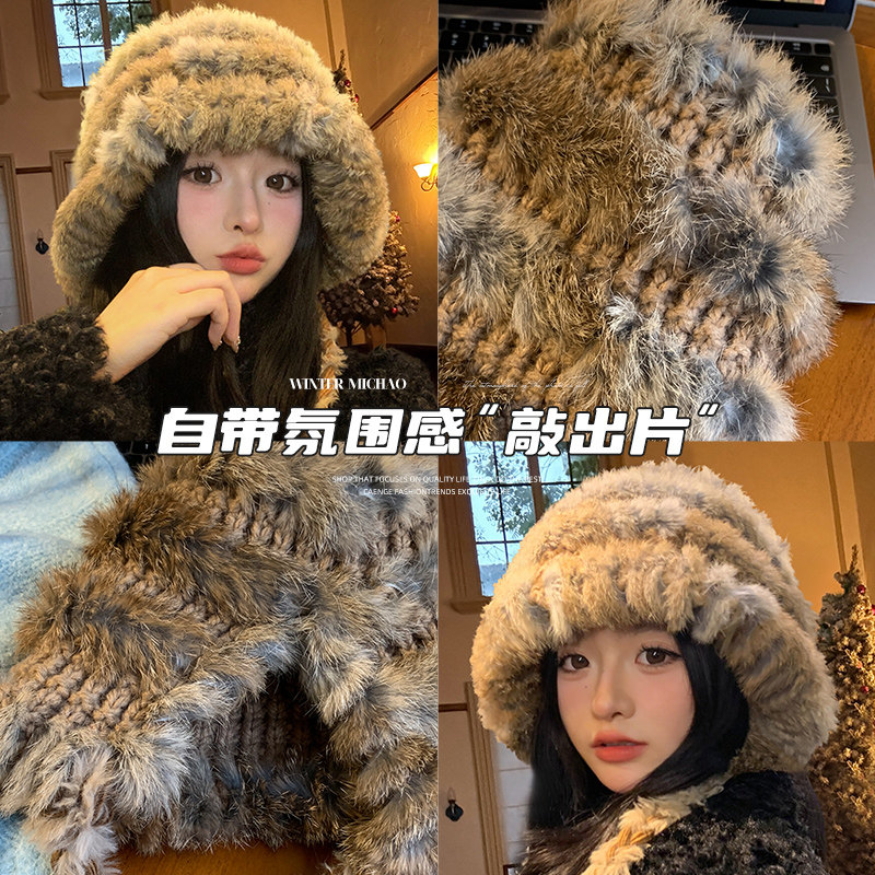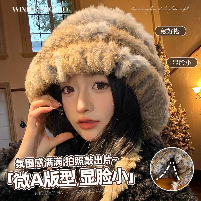 帽子女秋冬兔毛针织渔夫帽显脸小2024新款大头围毛绒帽保暖护耳帽