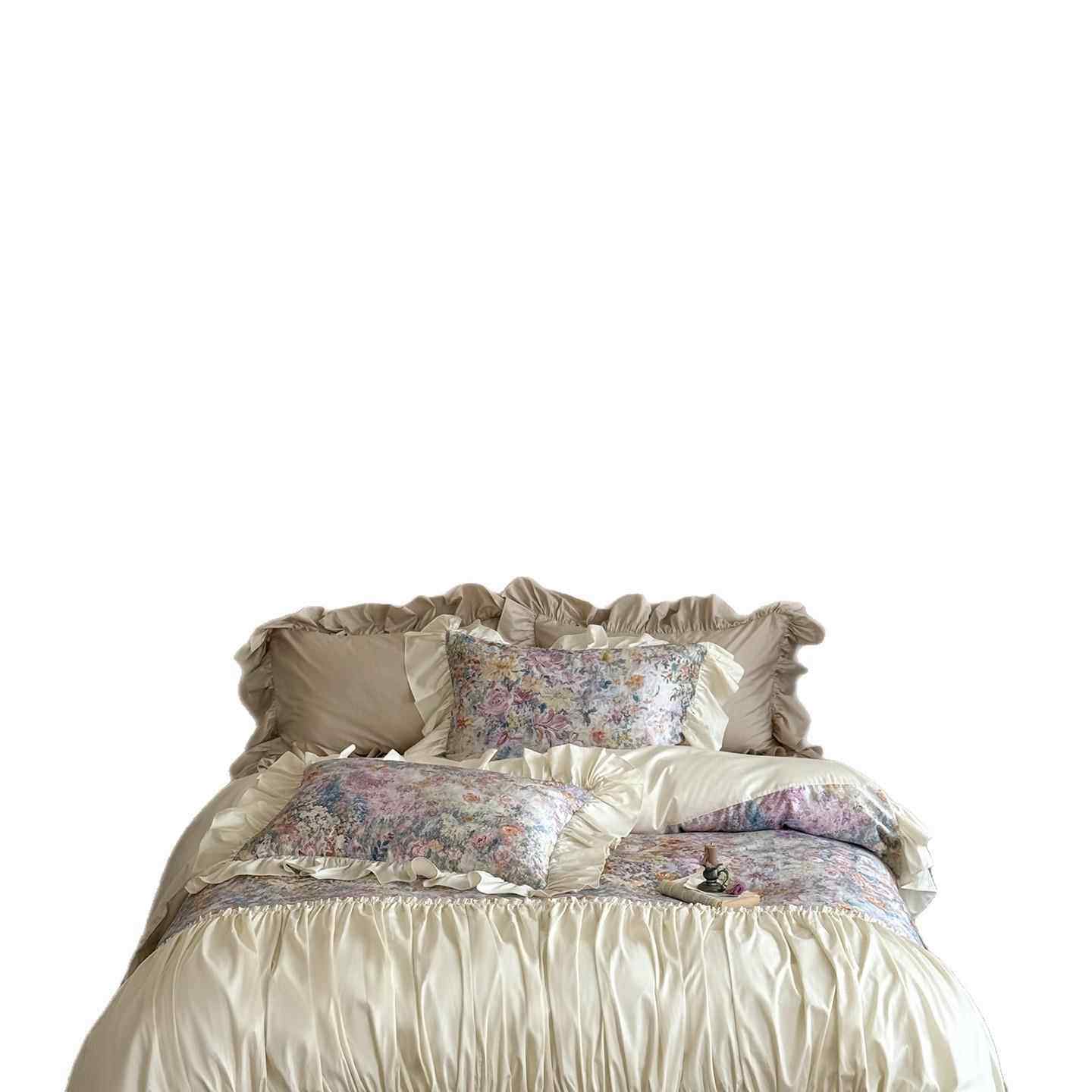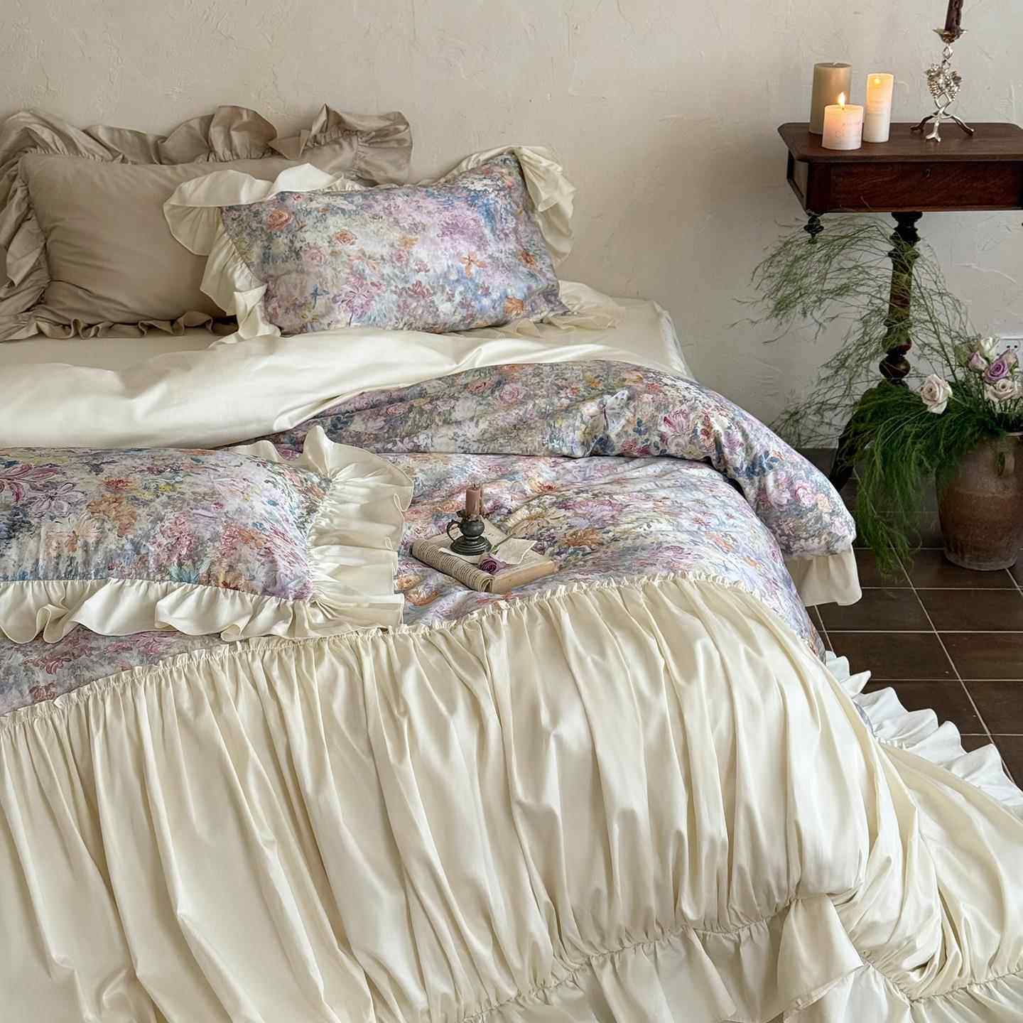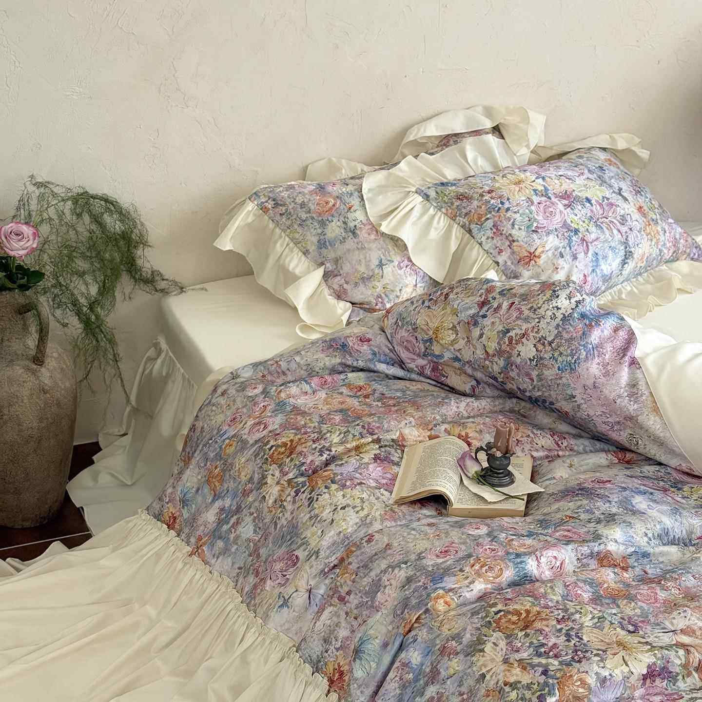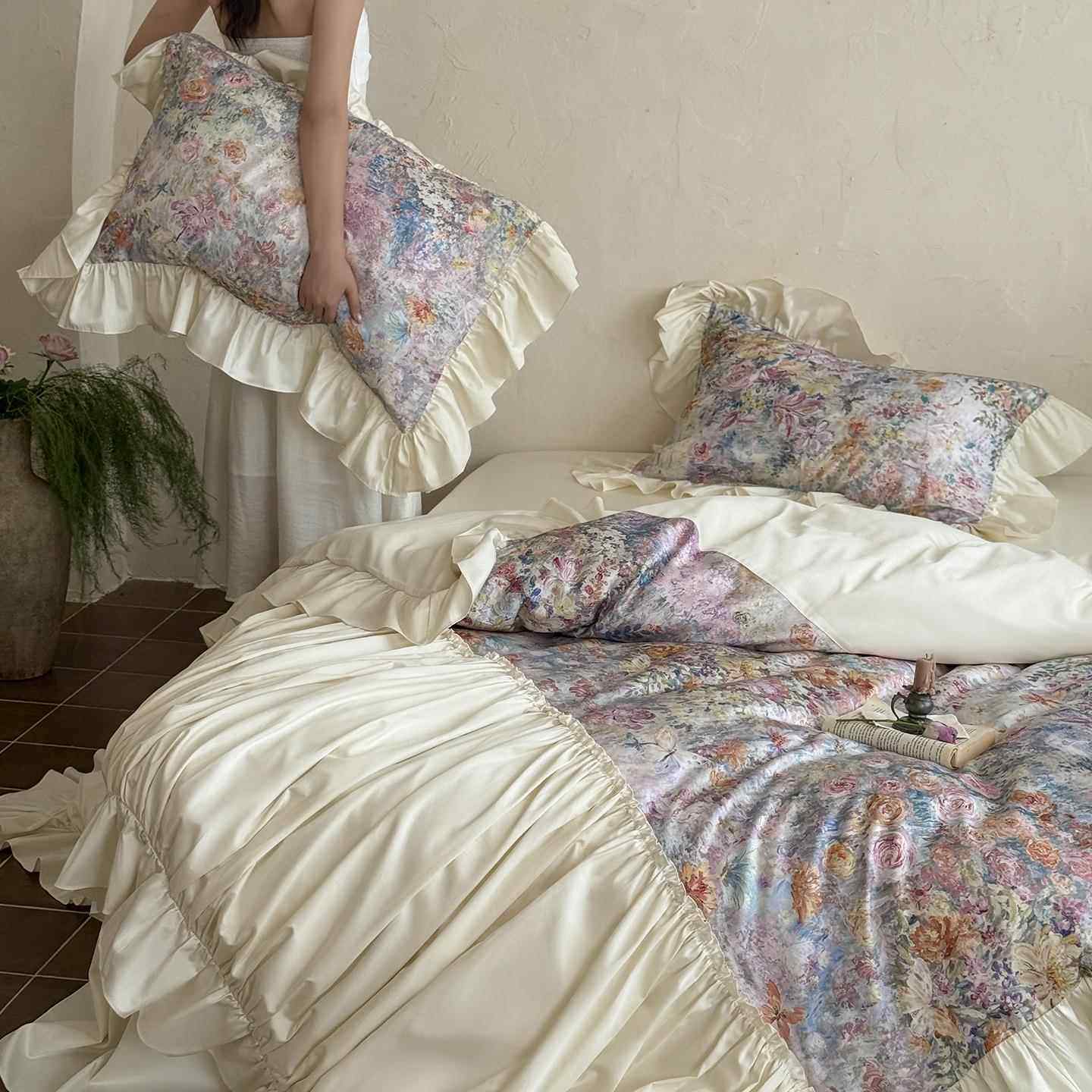 法式50支双股贡缎全棉花边床裙款四件套少女心高级复古花卉床品