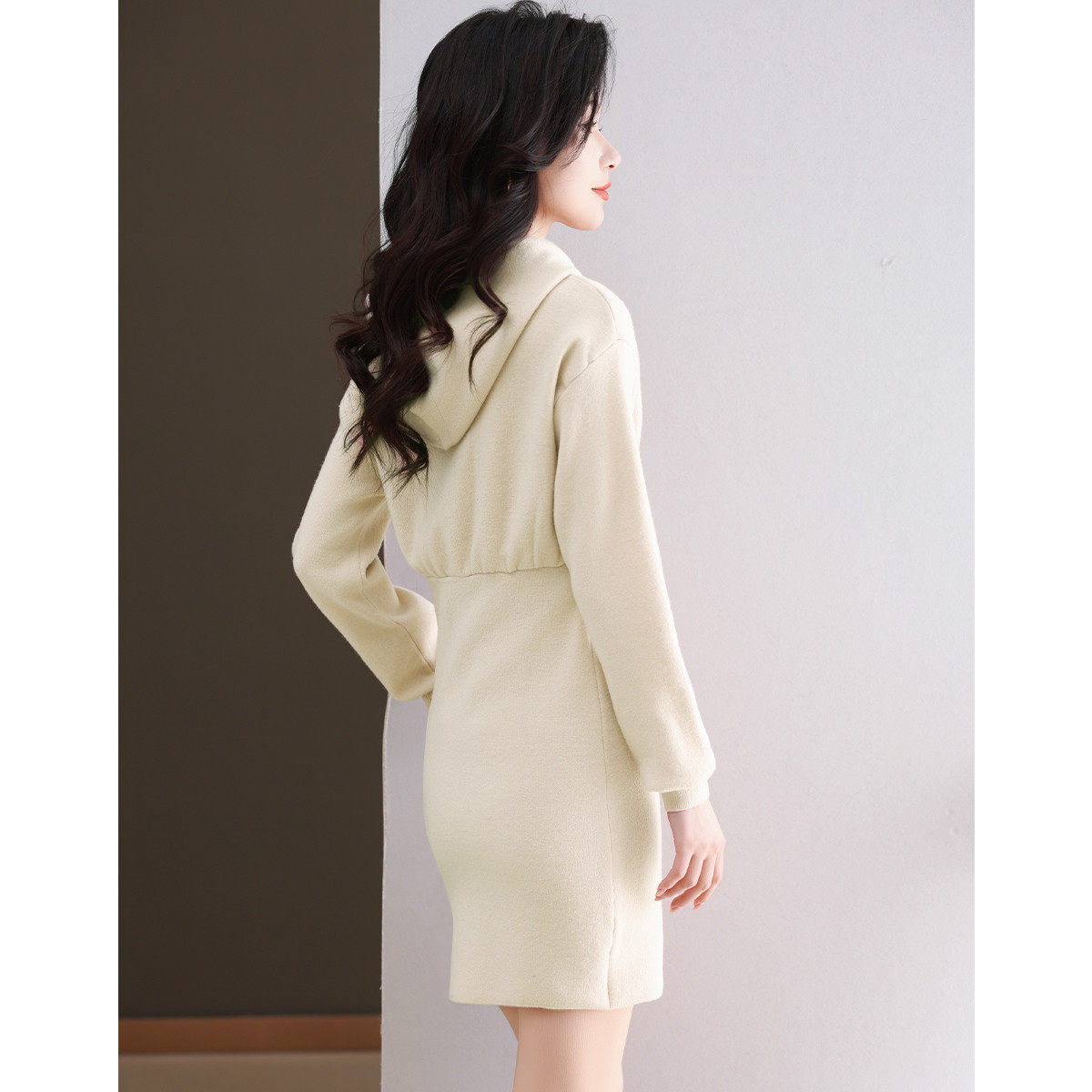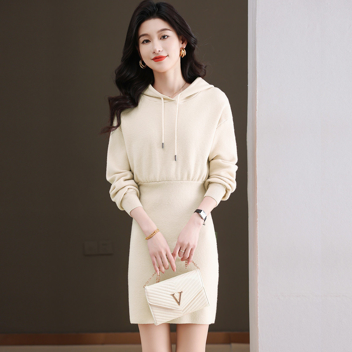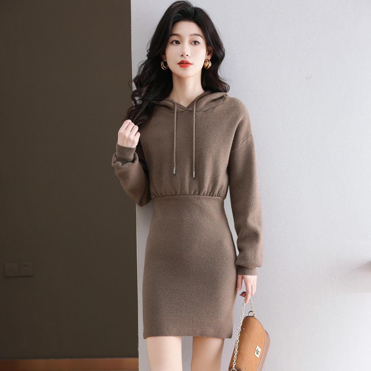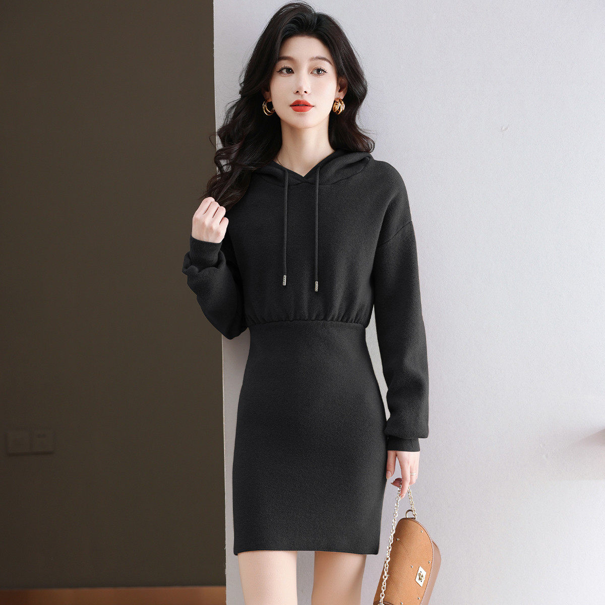 休闲连帽系带连衣裙女25年秋冬纯色简约修身显瘦针织中裙女款