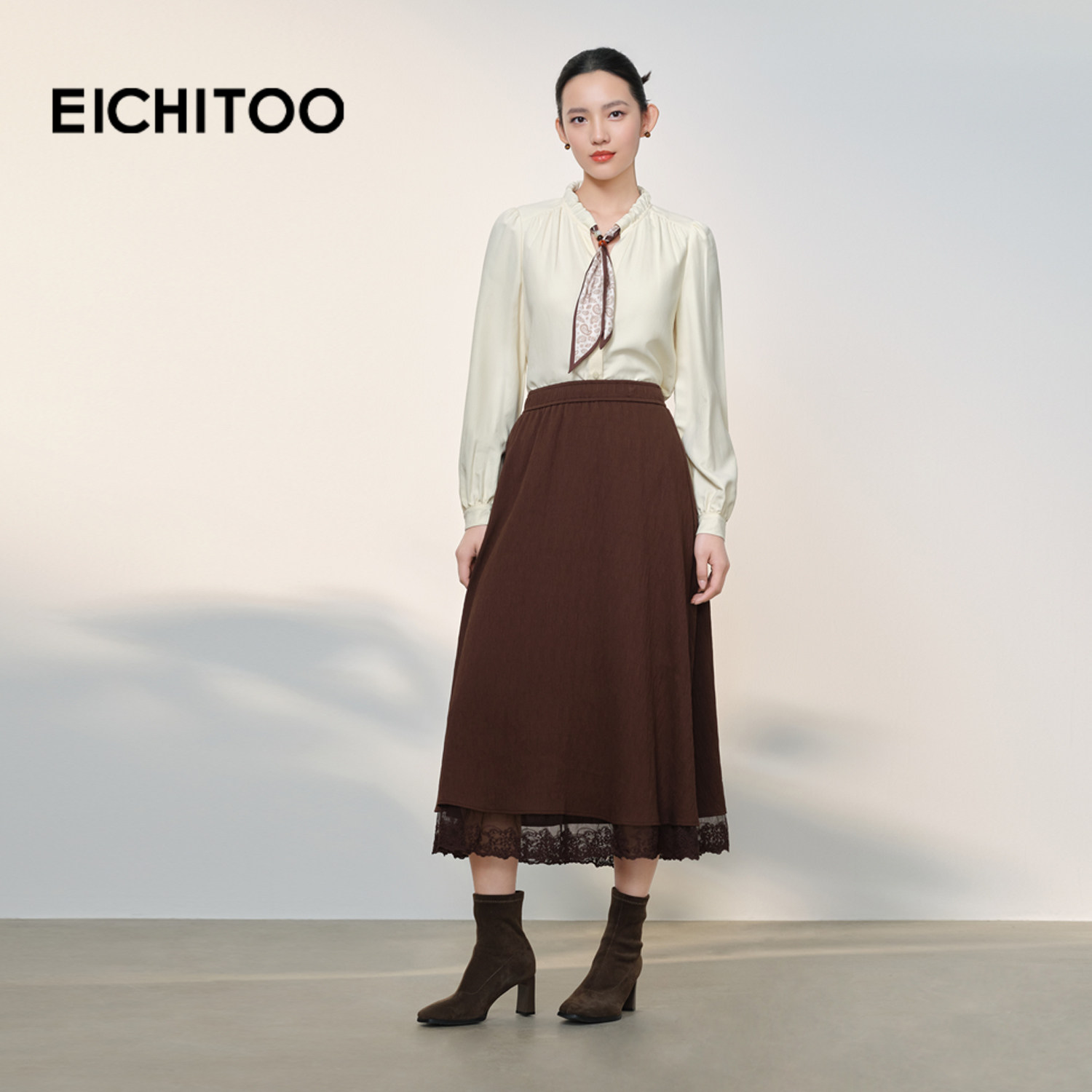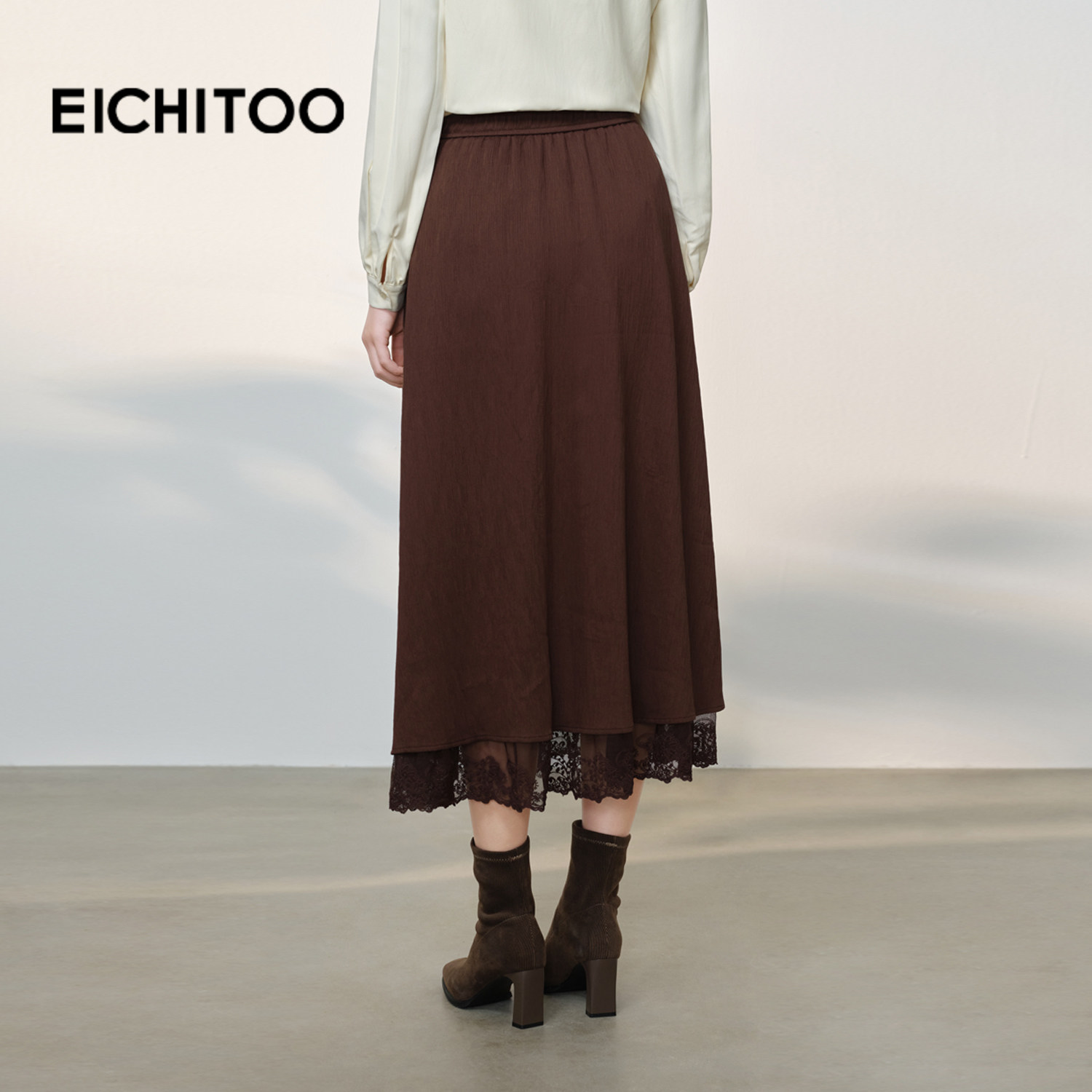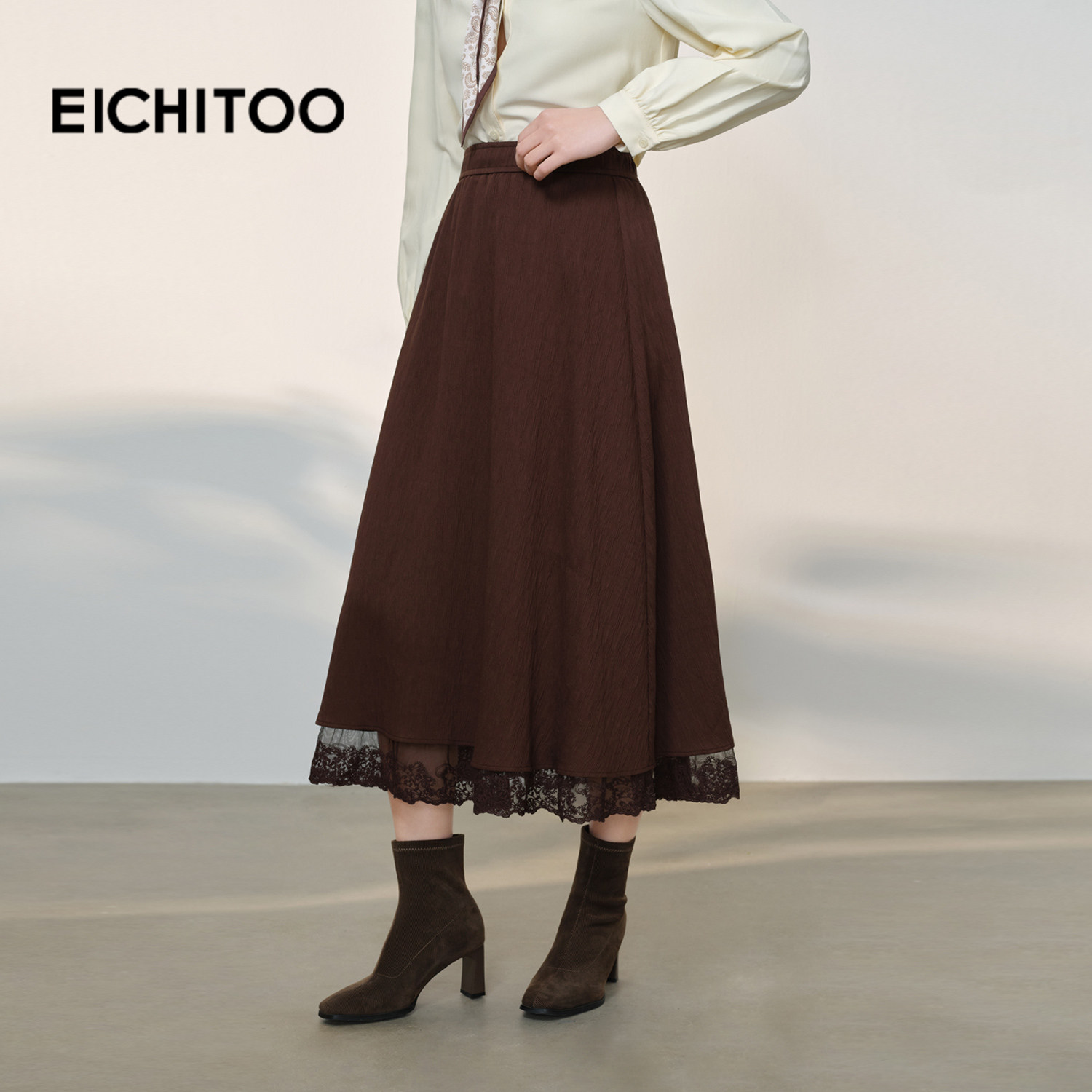 爱居兔蕾丝拼接咖色半身裙女2026年春季新款优雅简约A字中长裙