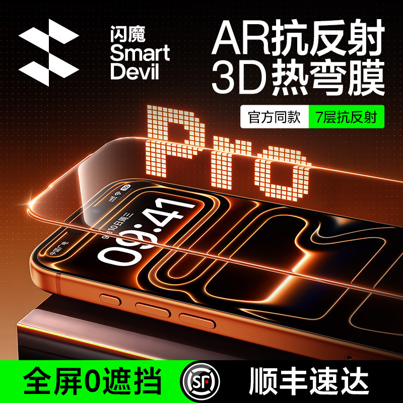 闪魔3D热弯AR抗反射钢化膜适用苹果17Promax屏幕膜iPhone16Pro新款增透Air全屏覆盖ip超薄防摔15手机保护贴膜