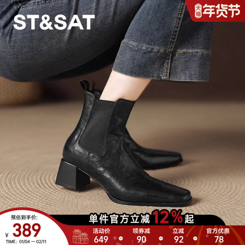 星期六加绒真皮短靴女2025新款秋冬季单靴高跟鞋粗跟瘦瘦靴女靴子