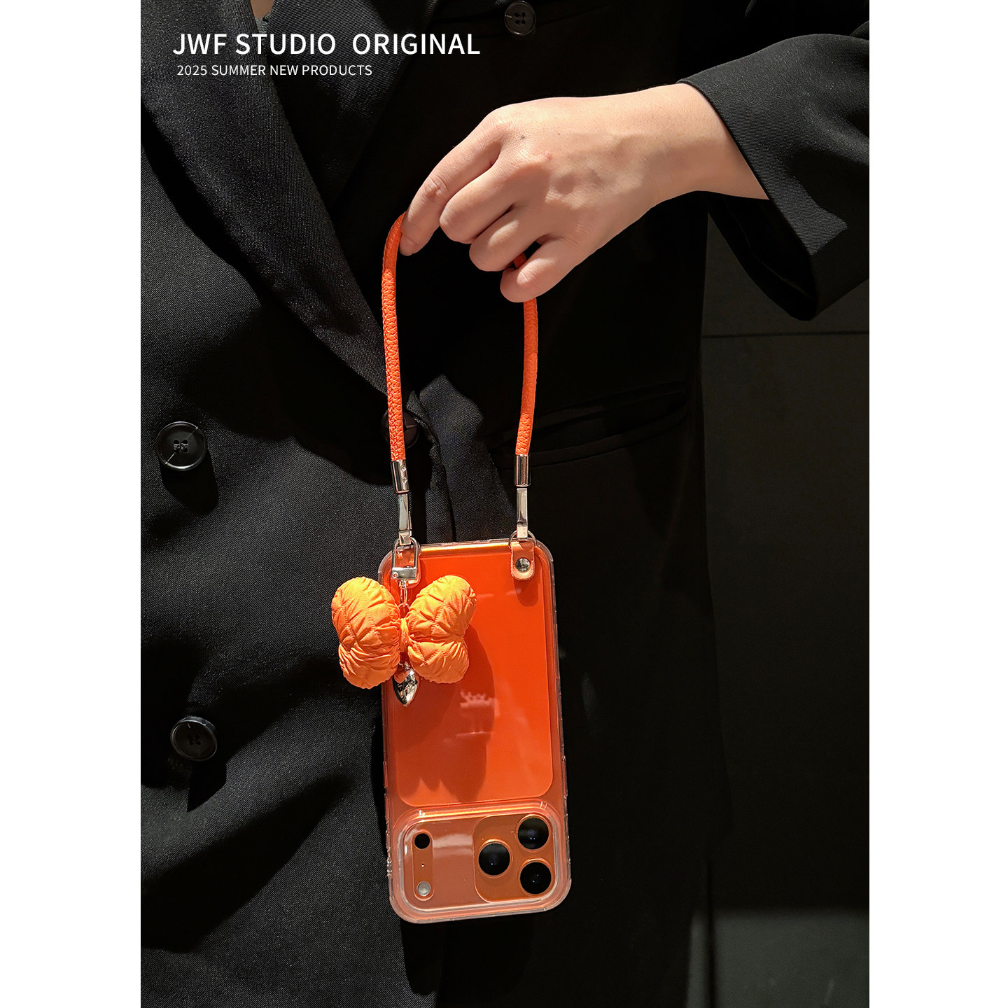 高级感橙色腕带适用苹果iphone17promax斜挎手机壳17蝴蝶结15秋冬14简约创意13镜头全包16pro小众女透明外壳