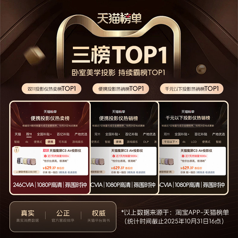 【李佳琦直播间&现货返场】天猫魔屏C3Air投影仪政府补贴家庭影院卧室便携家用超高清新款投影机真1080P