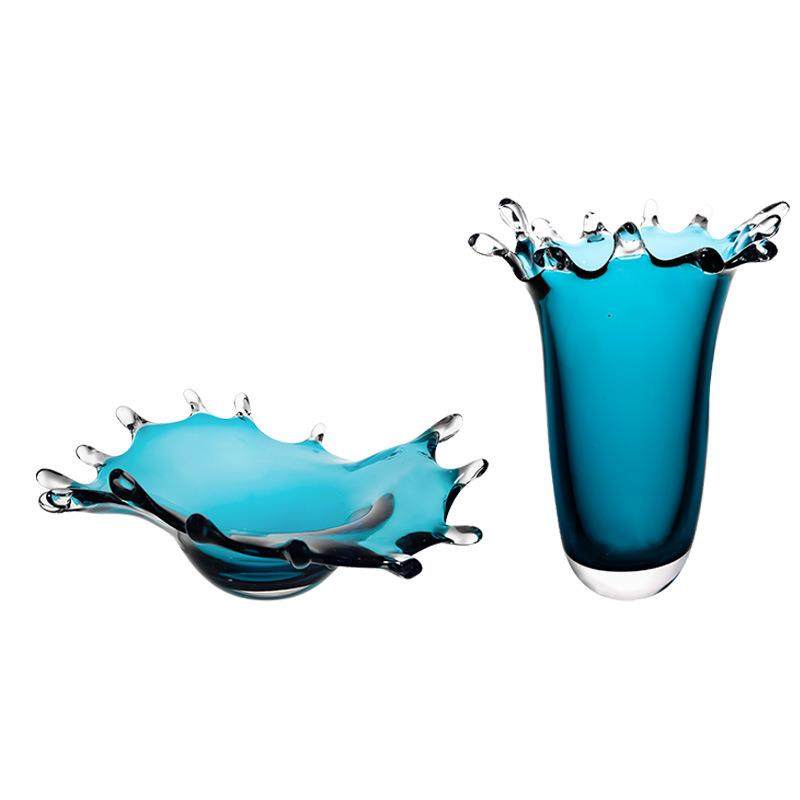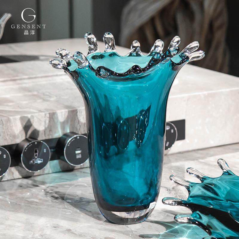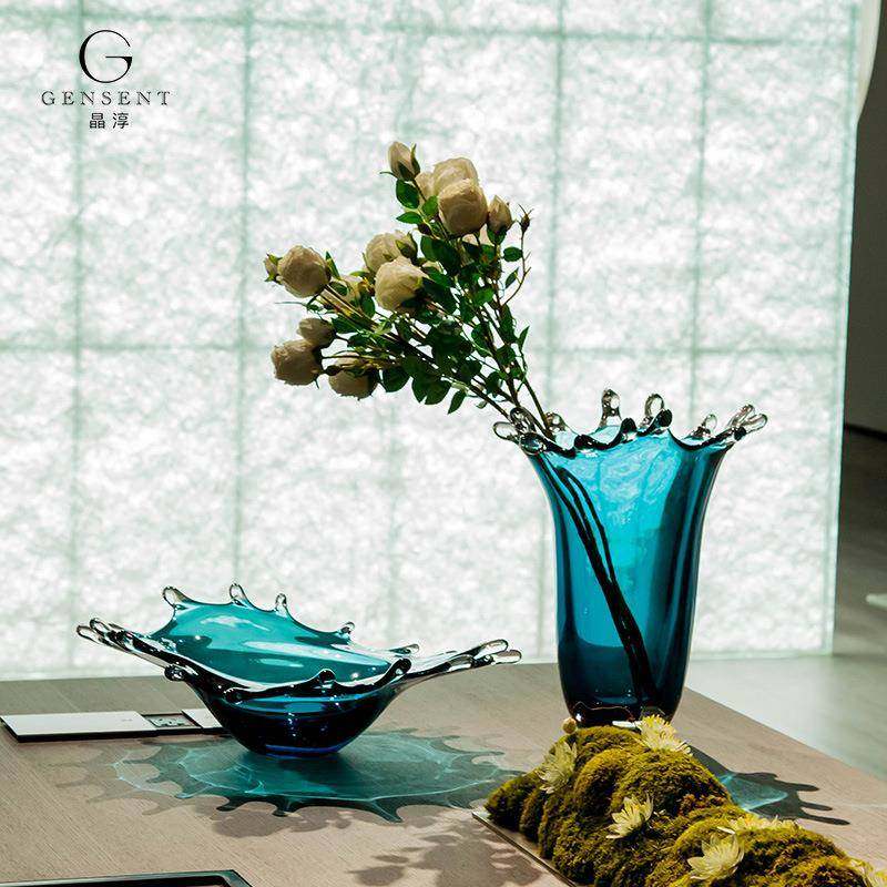 晶淳 半海系列 创意海蓝色水晶琉璃花瓶果盘套装 高档客餐厅软装