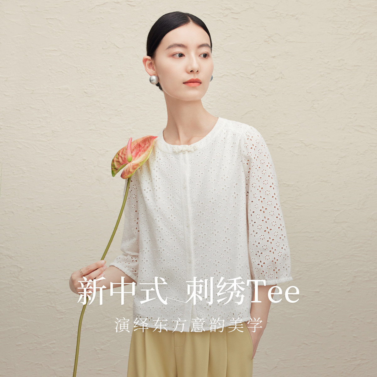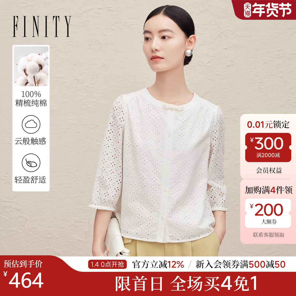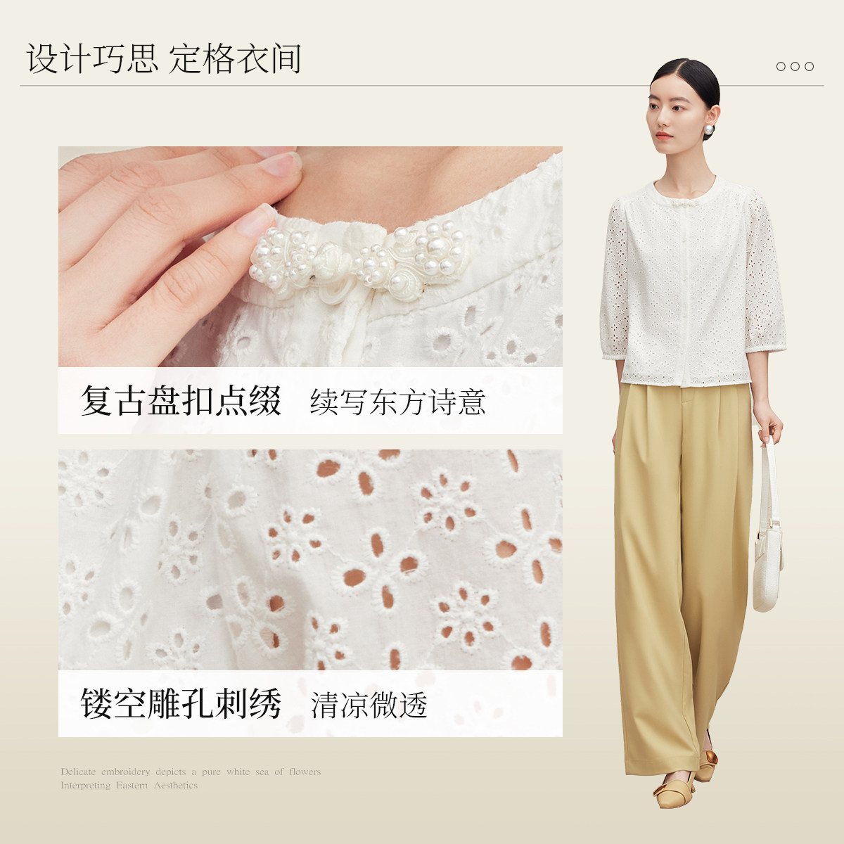 菲妮迪新中式刺绣衬衫2025年秋季新款白色镂空100%纯棉盘扣小衫女