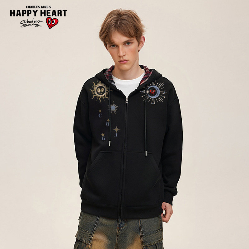 查尔斯桃心美式格子开衫连帽卫衣男女宽松秋季太阳和月亮印花外套