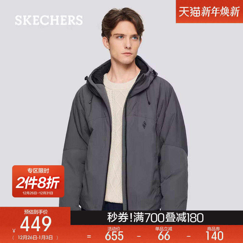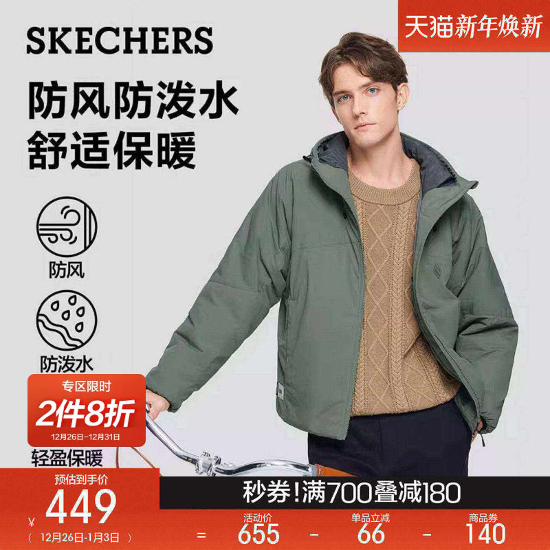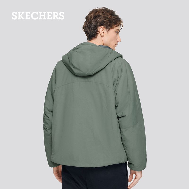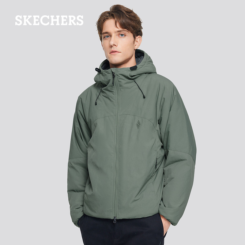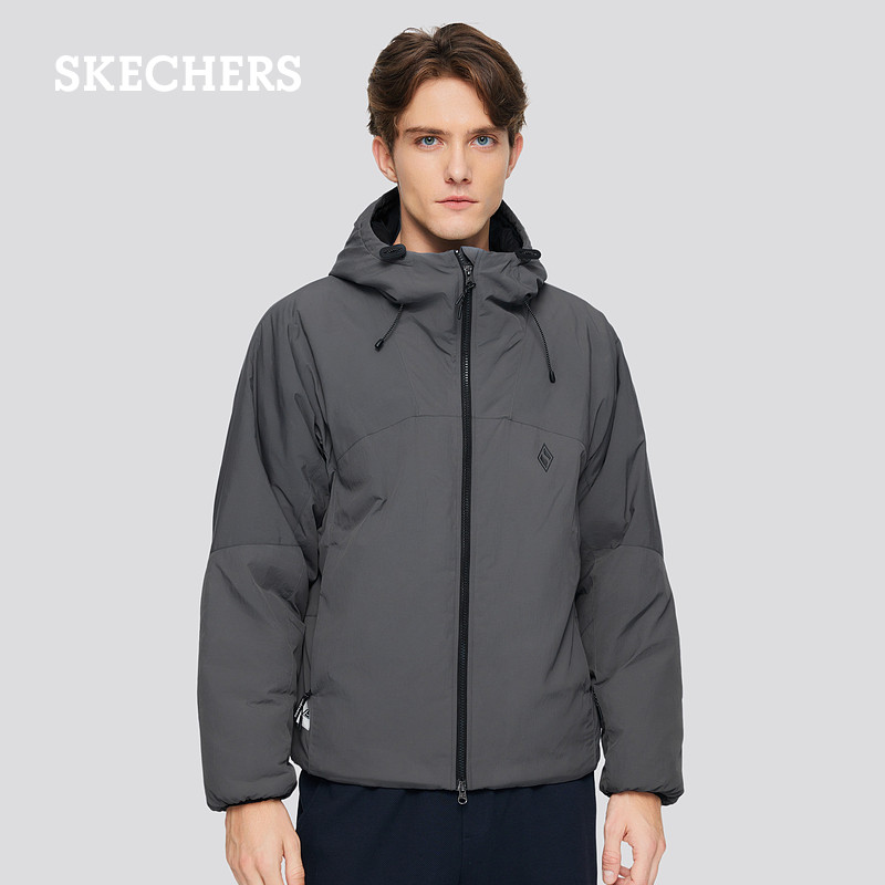 斯凯奇冬季新款男子宽松连帽拉链梭织防水外套夹克风衣保暖棉服