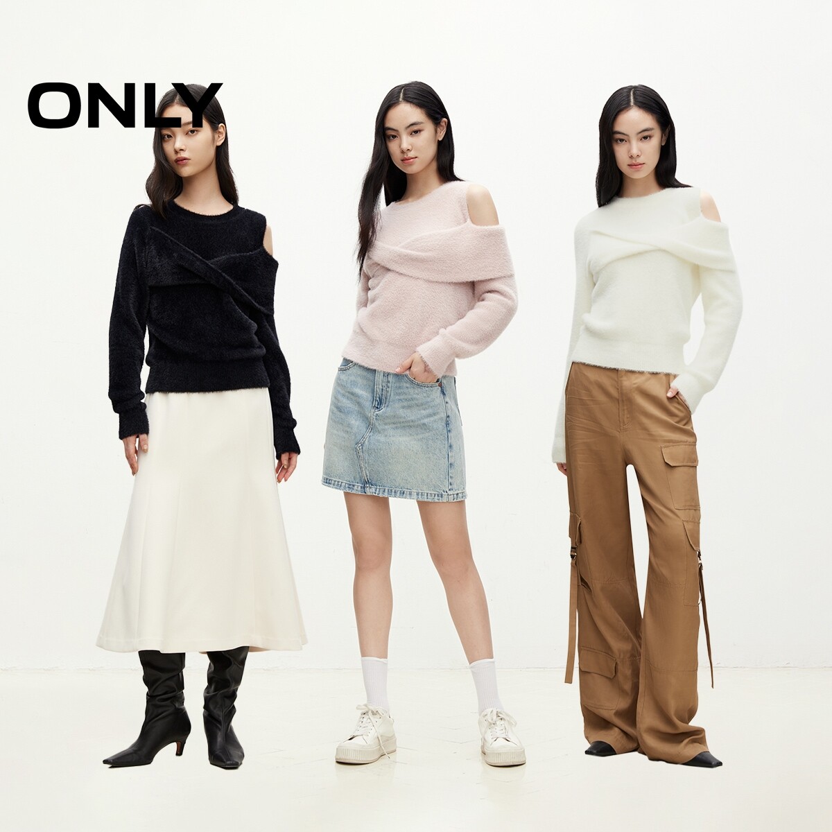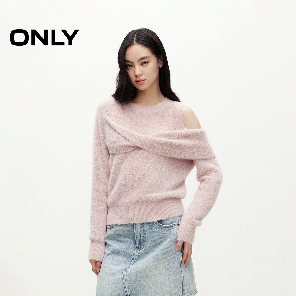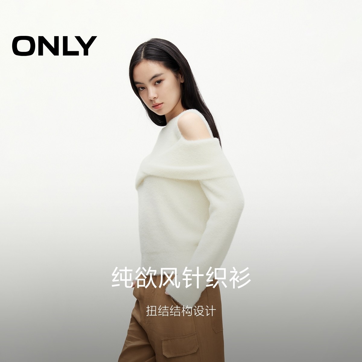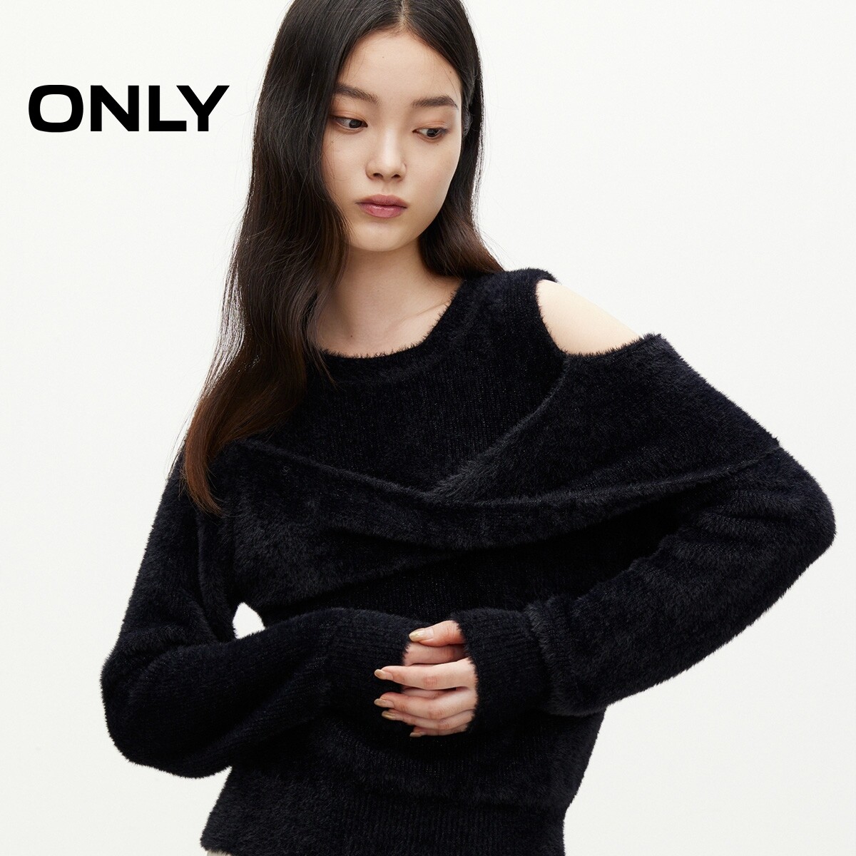 ONLY冬季时尚百搭慵懒圆领露肩纯色针织衫上衣女|124313010