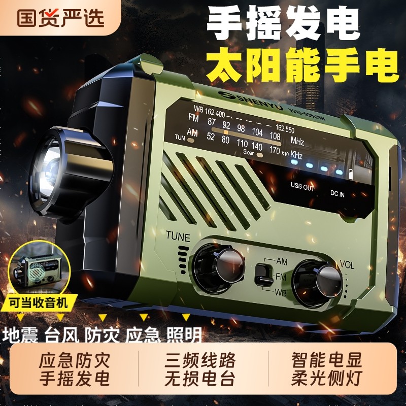 太阳能手摇发电收音机应急手电筒强光超亮多功能救援野外生存装备