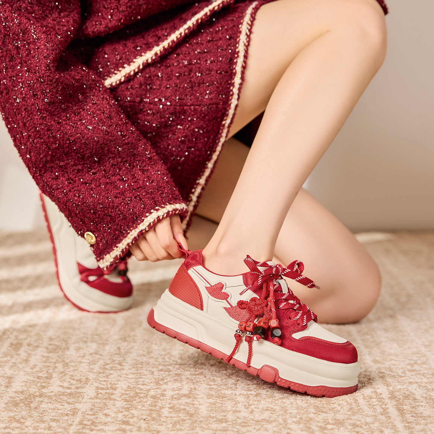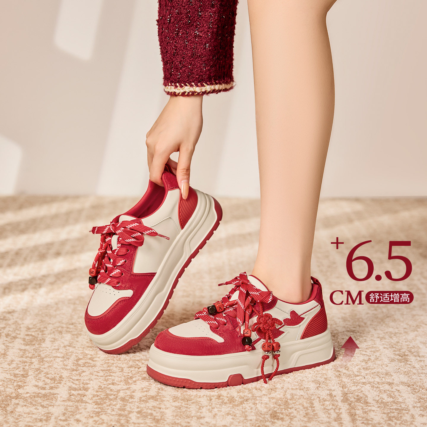奥康 女鞋2025秋季厚底增高拼色松糕底板鞋红色休闲鞋门店发货