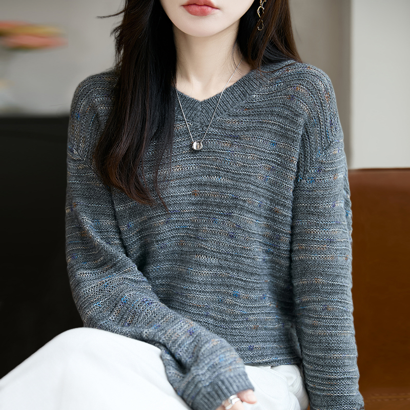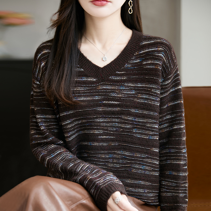 撤标撤柜(A)V领条纹针织打底衫女春秋洋气上衣大码女装秋冬毛衣