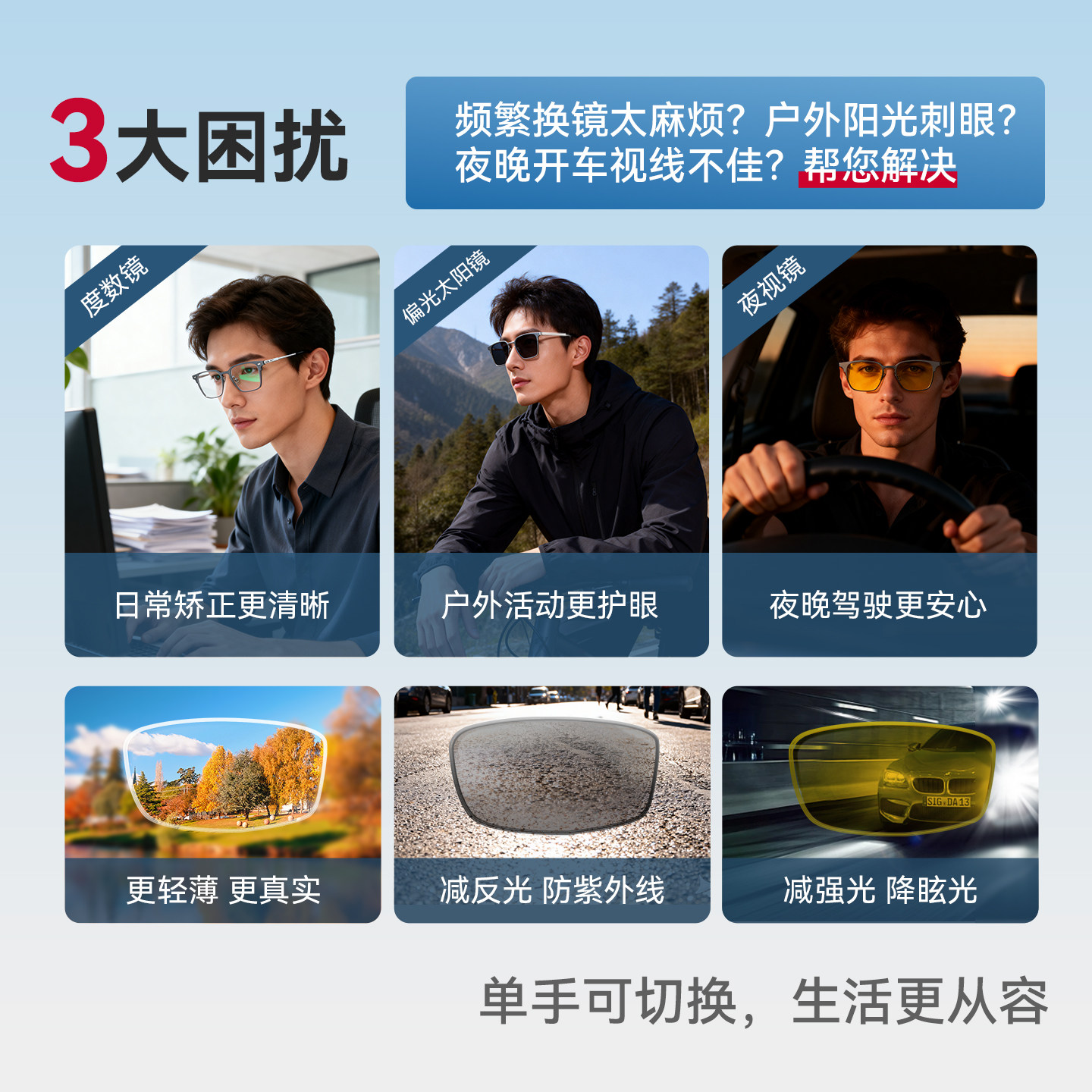 康耐特三合一轻钛磁吸偏光太阳镜墨镜防远光夜视驾驶镜近视眼镜片