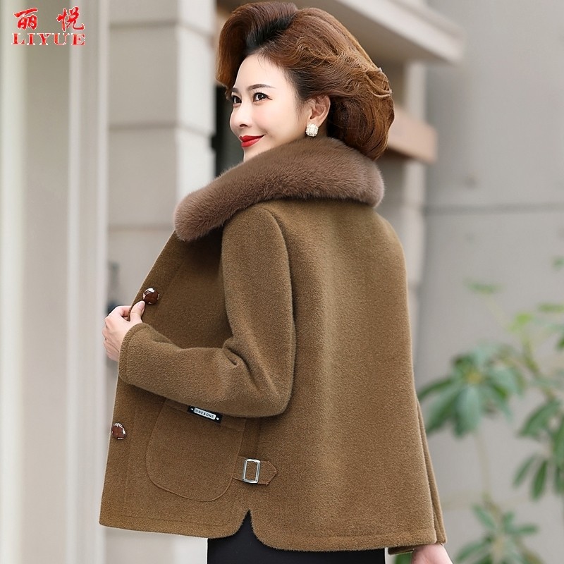 妈妈冬装新款水貂绒毛呢外套中老年女装秋冬洋气短款皮草上衣红色