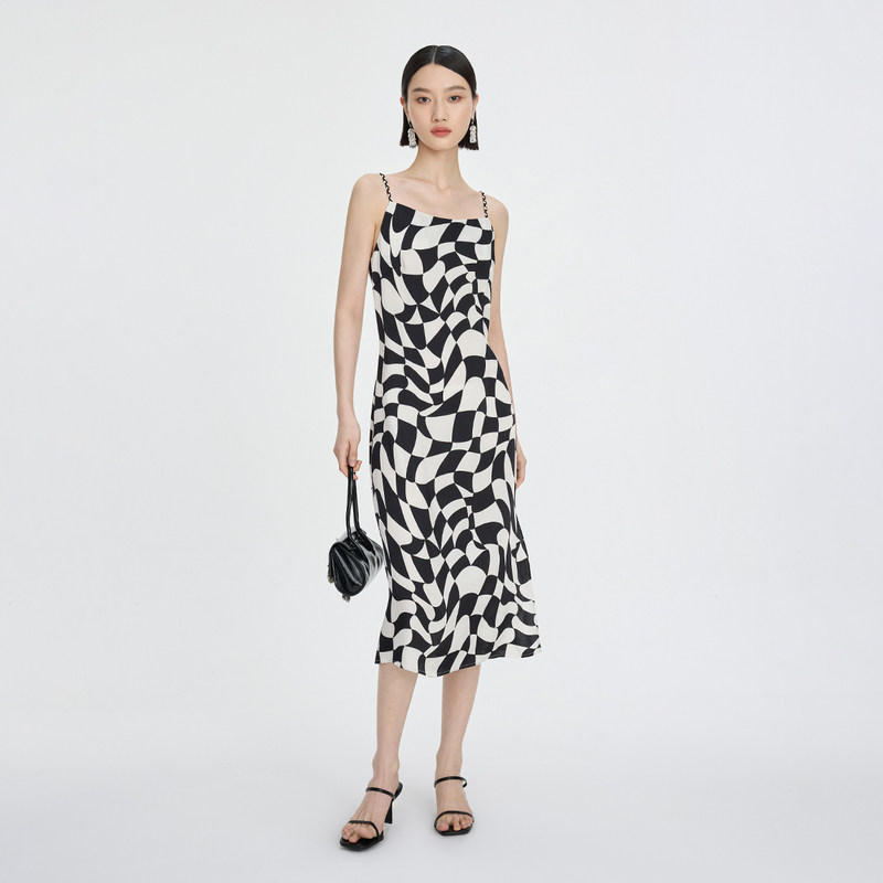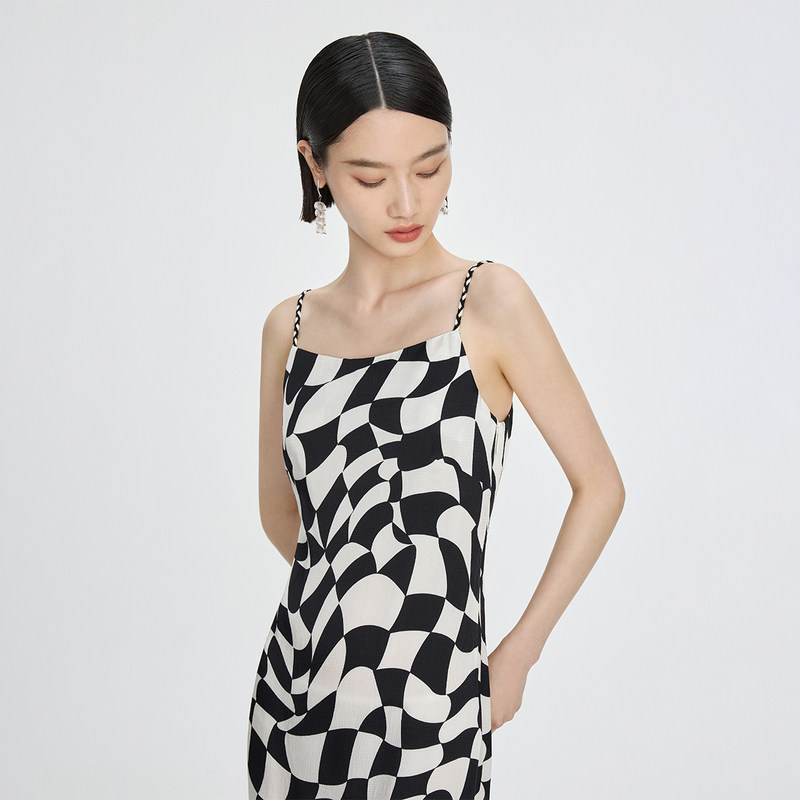 商场同款naivee纳薇夏复古棋盘格气质设计感开衩吊带连衣裙