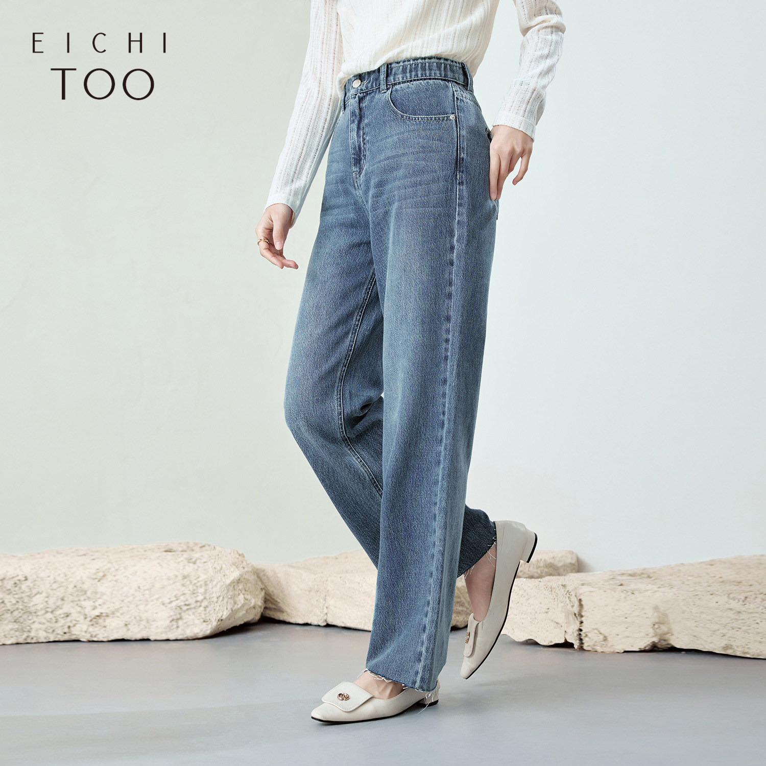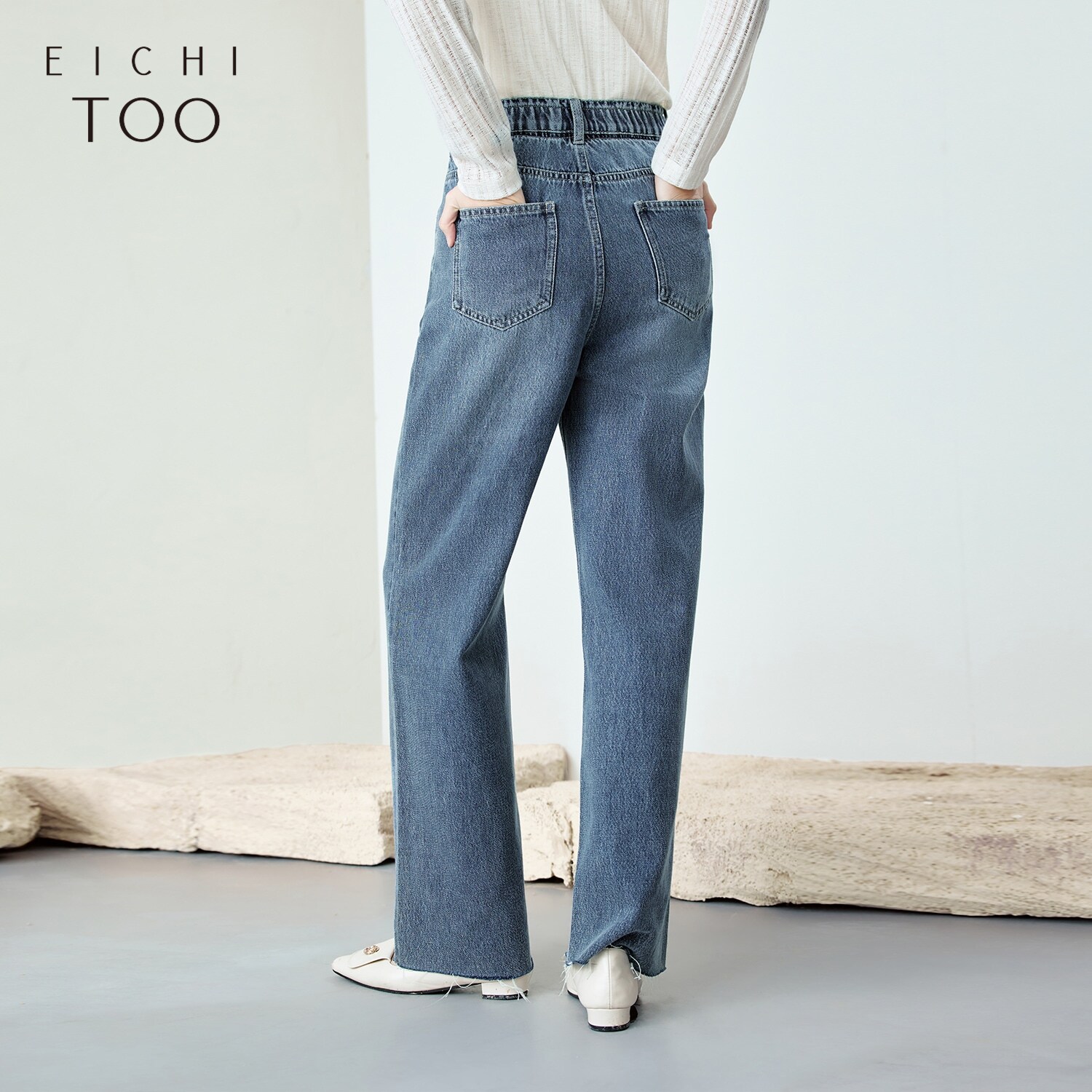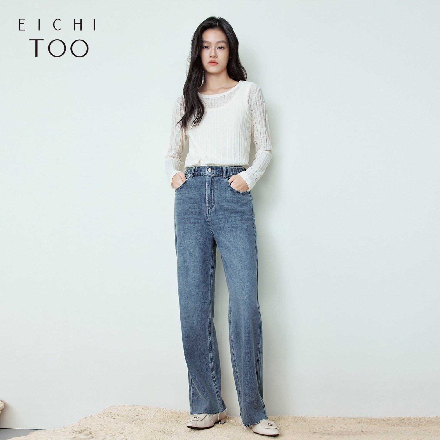 twosweet【超级裤神】四面弹重塑大长腿高腰直筒微喇叭原色牛仔裤