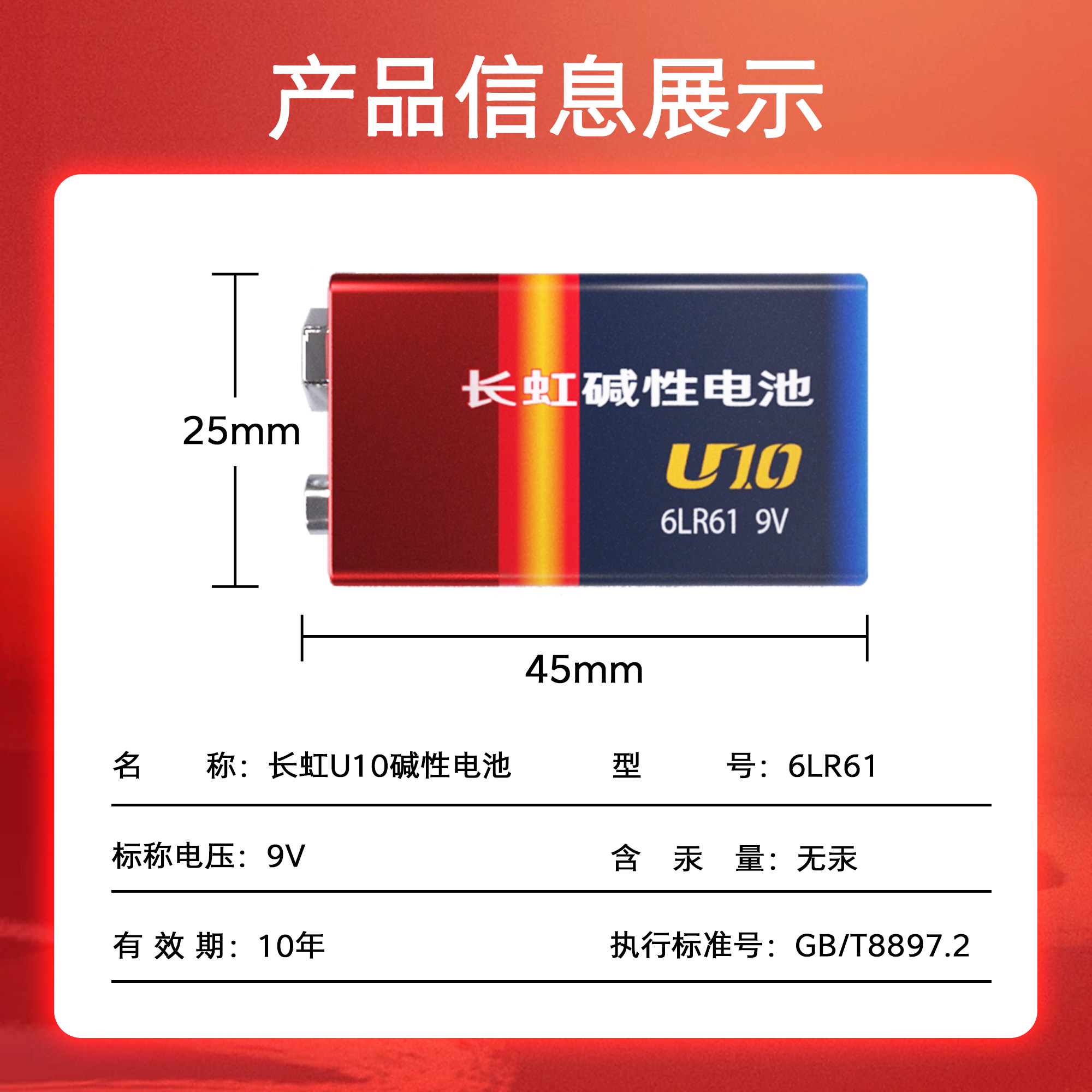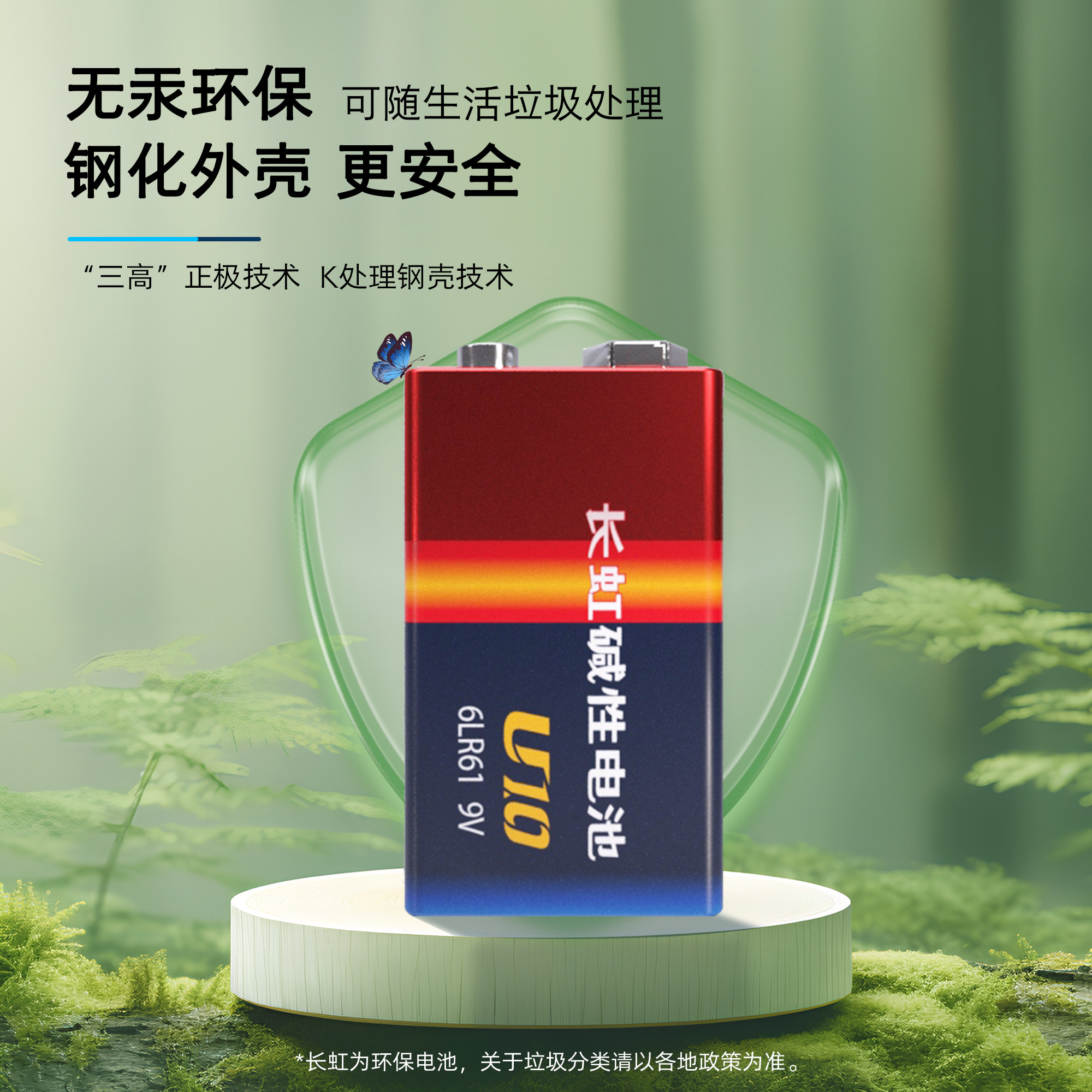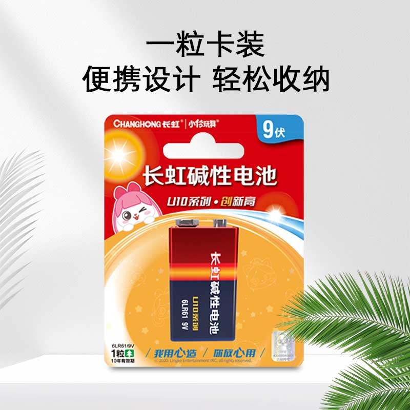 长虹电池U10系列9V碱性方块电池6LR61万用表烟雾报警叠层九伏电池1粒卡装