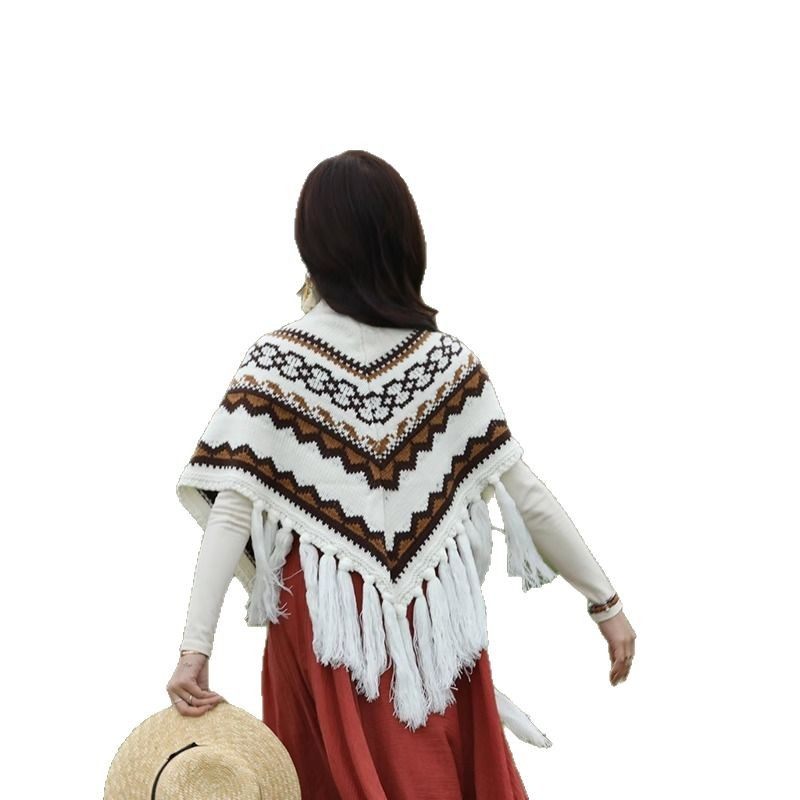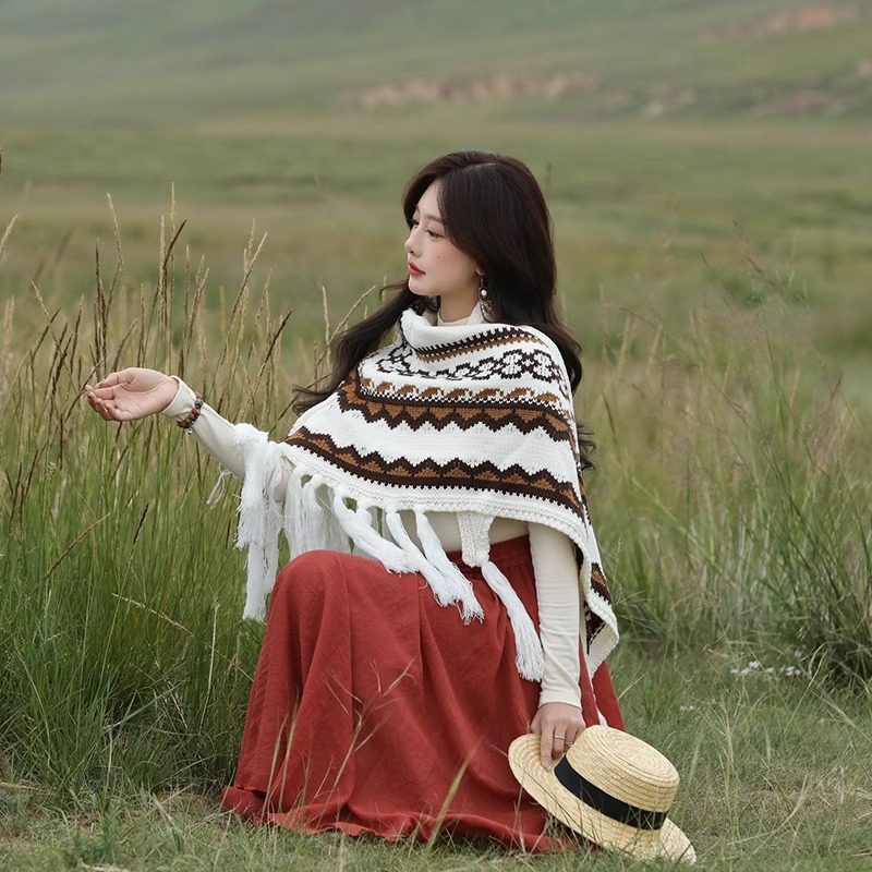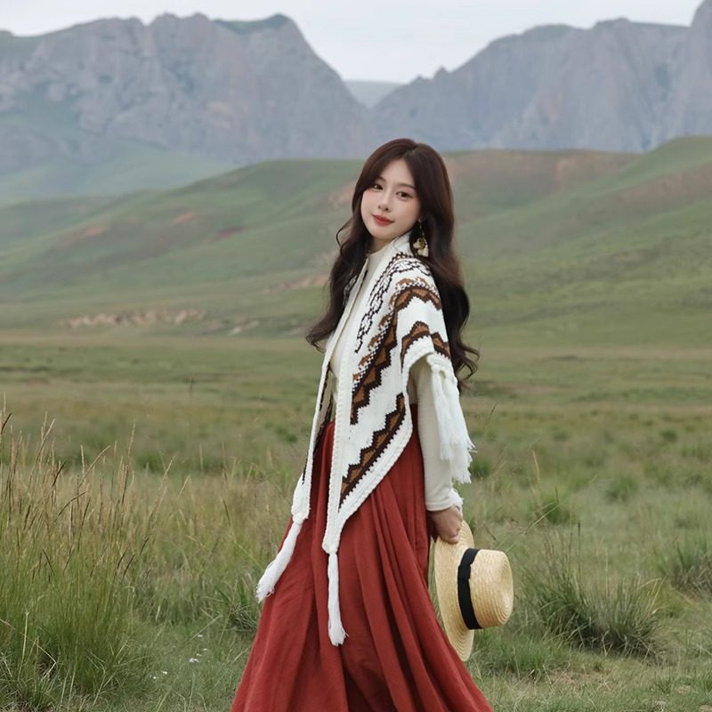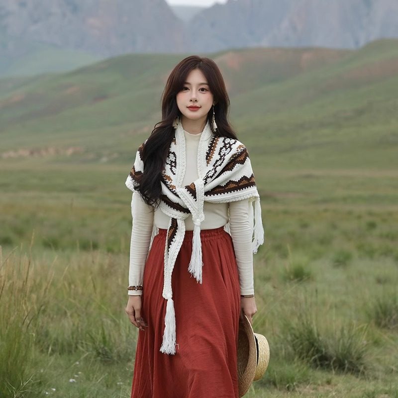 流苏波西米亚外搭毛线三角披肩女青海西藏云南披风斗篷民族风围巾