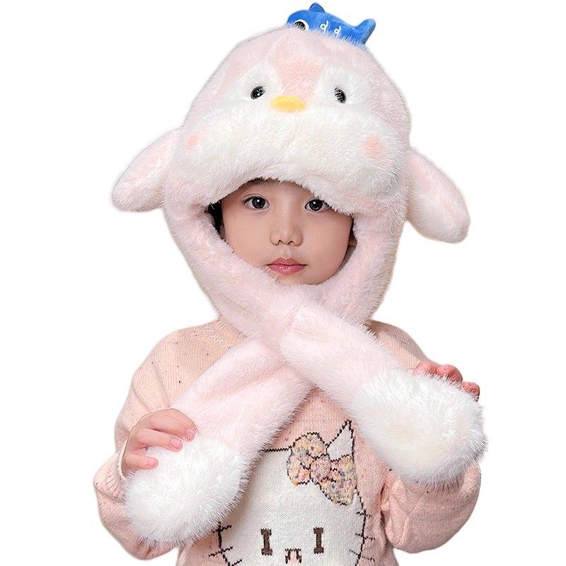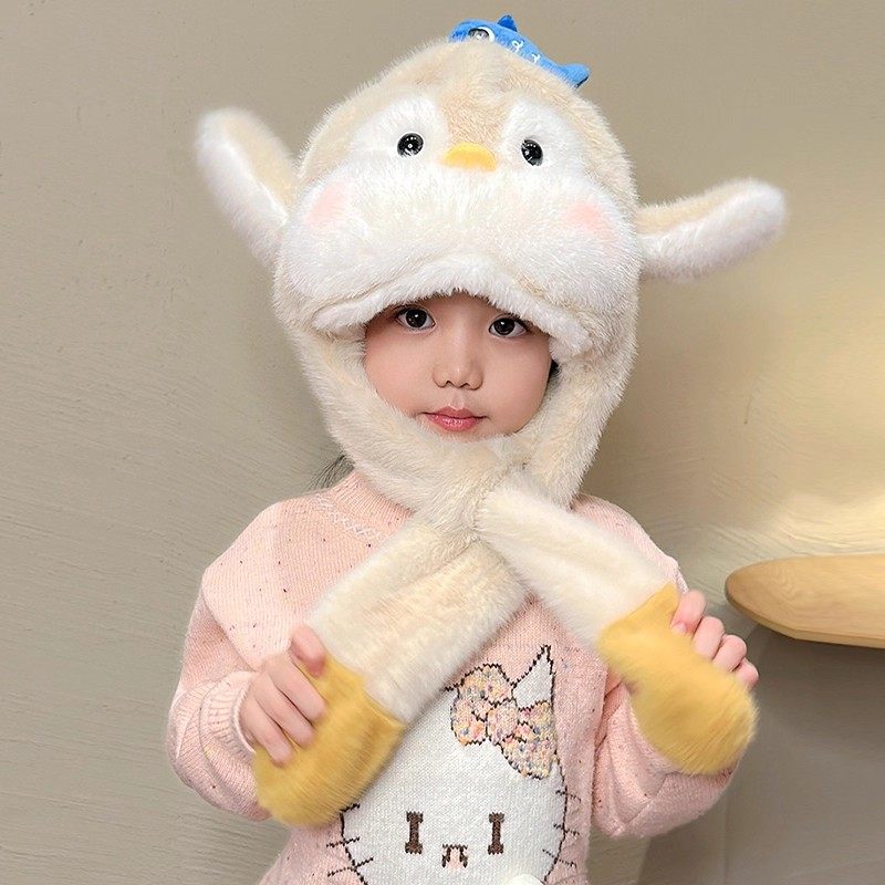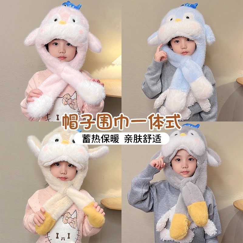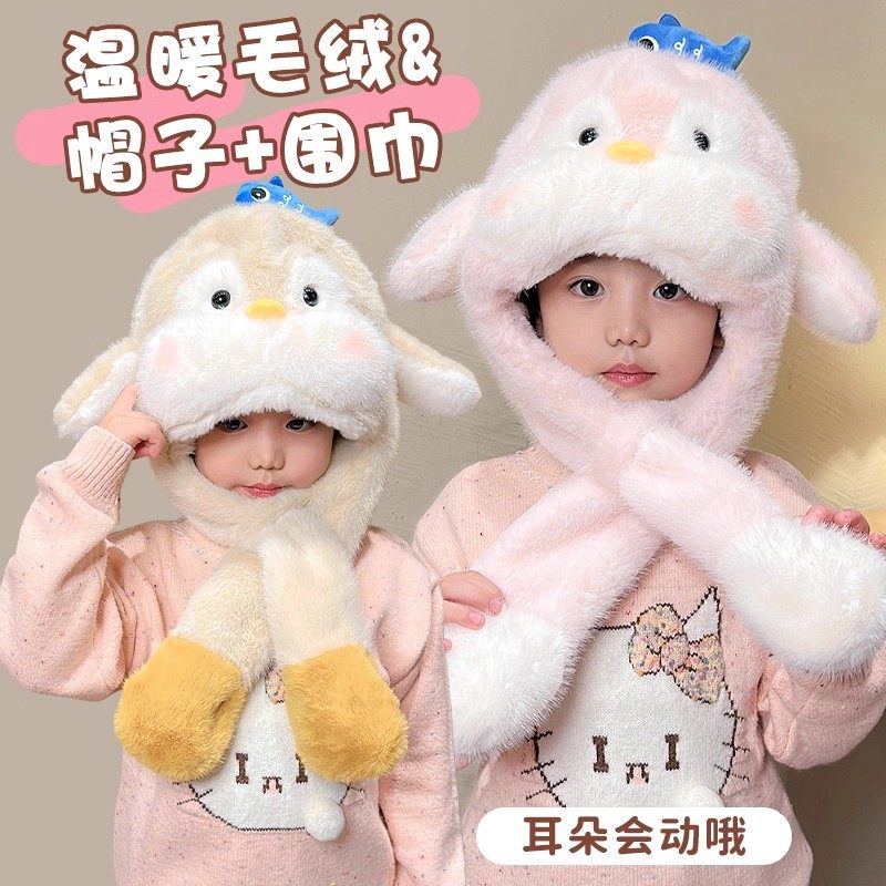 儿童耳朵会动可爱企鹅毛绒帽子围巾一体加厚保暖防寒骑车护耳帽女