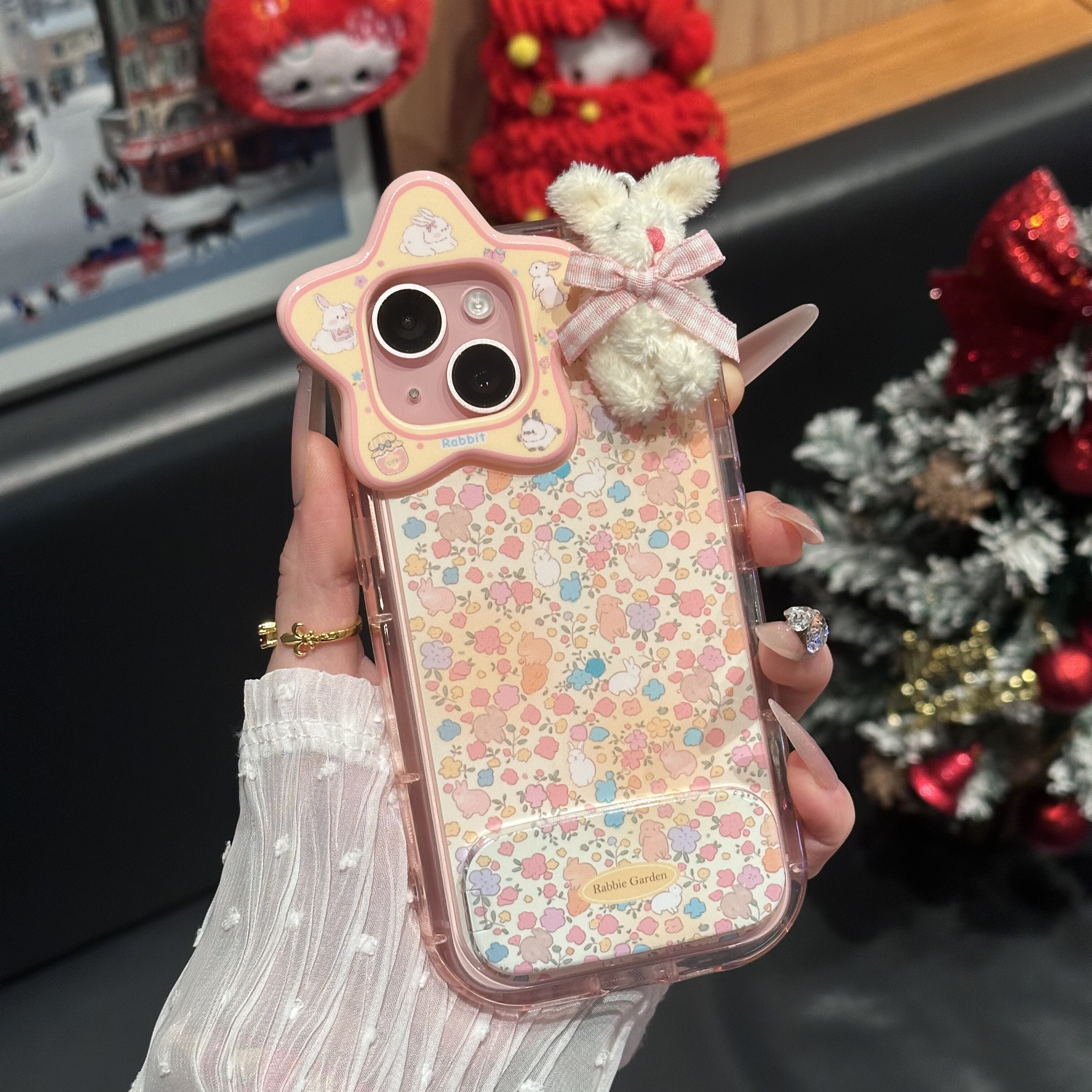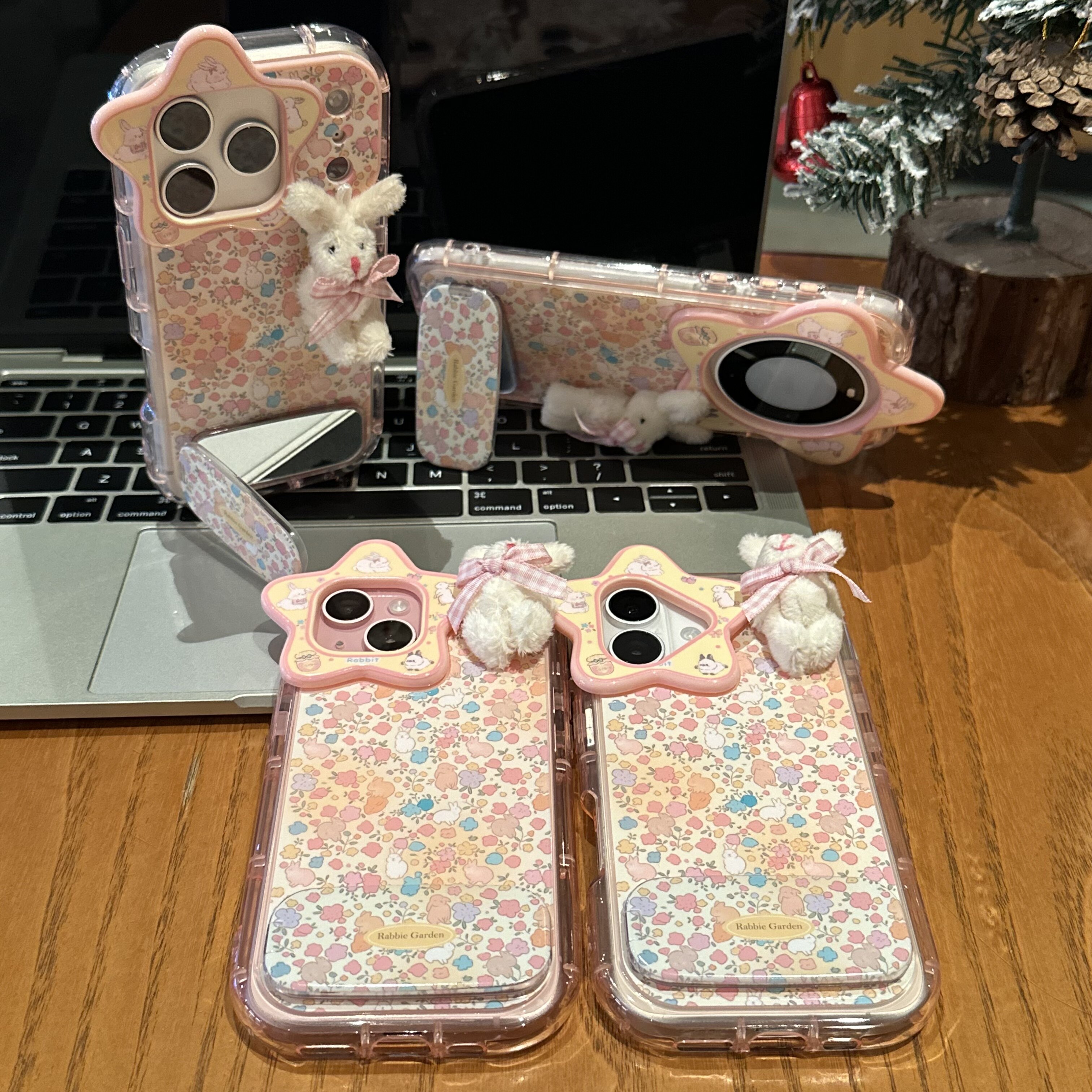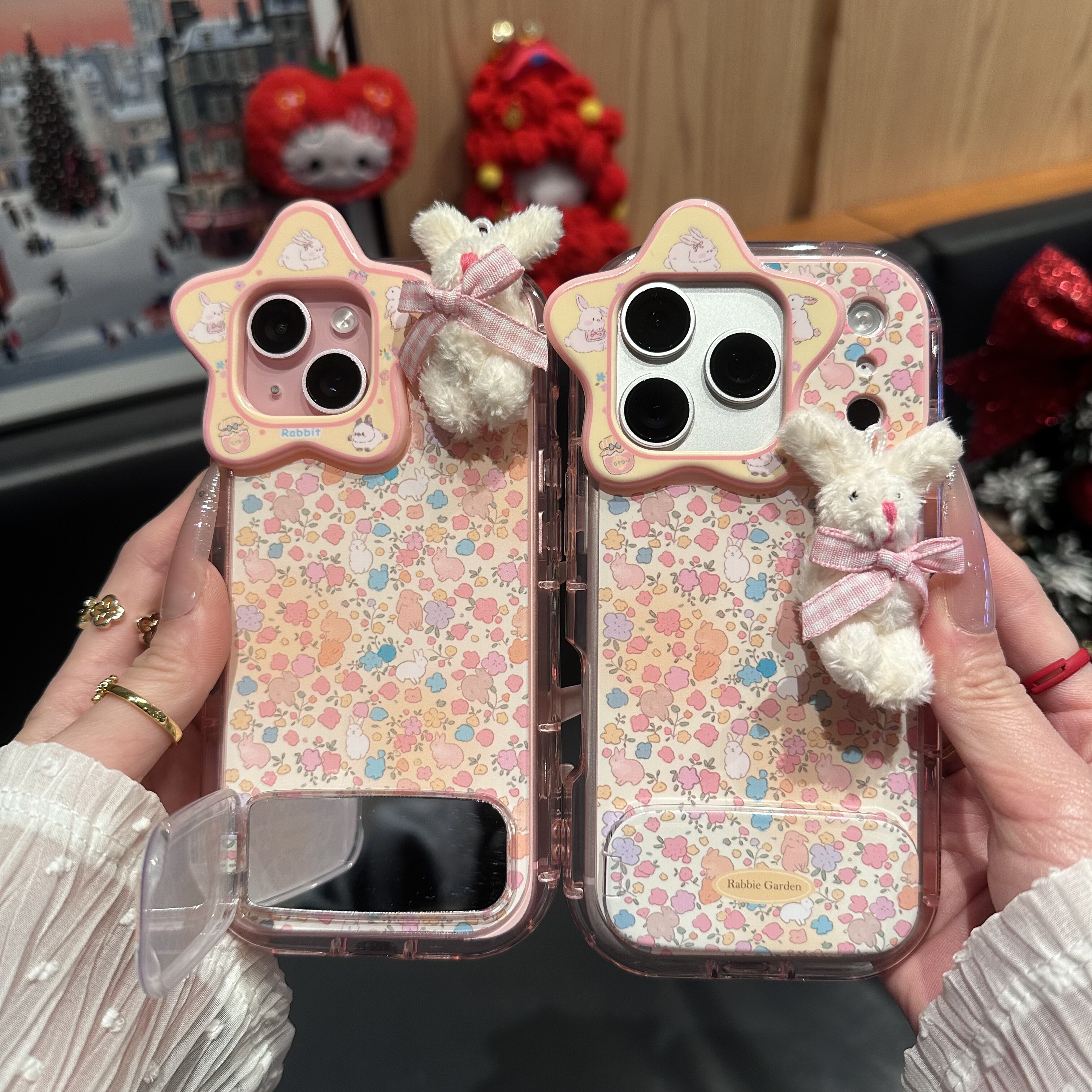 蝴蝶结碎花兔兔适用苹果17promax镜面支架手机壳iPhone16星星镜头华为Mate70立体兔兔vivox200全包荣耀400软