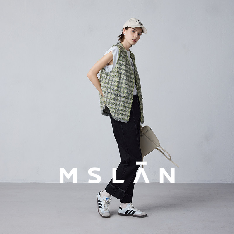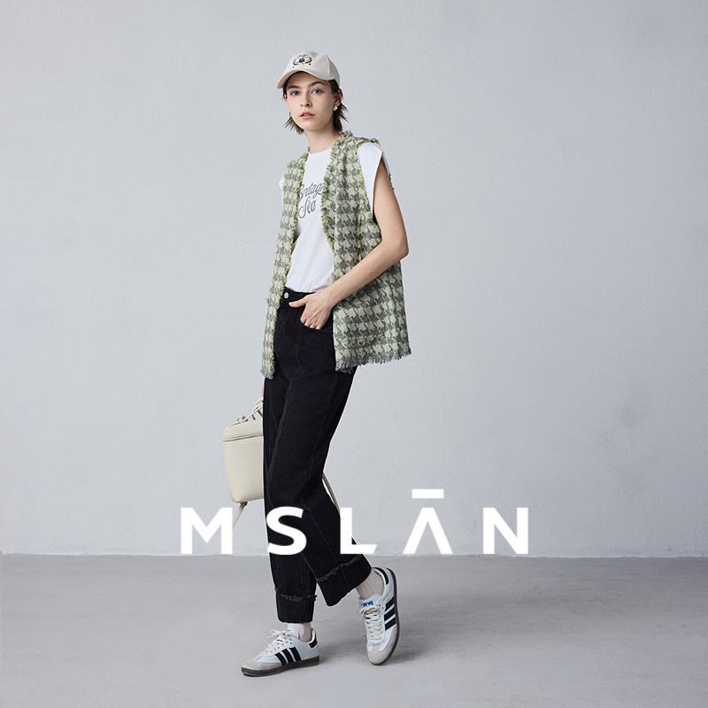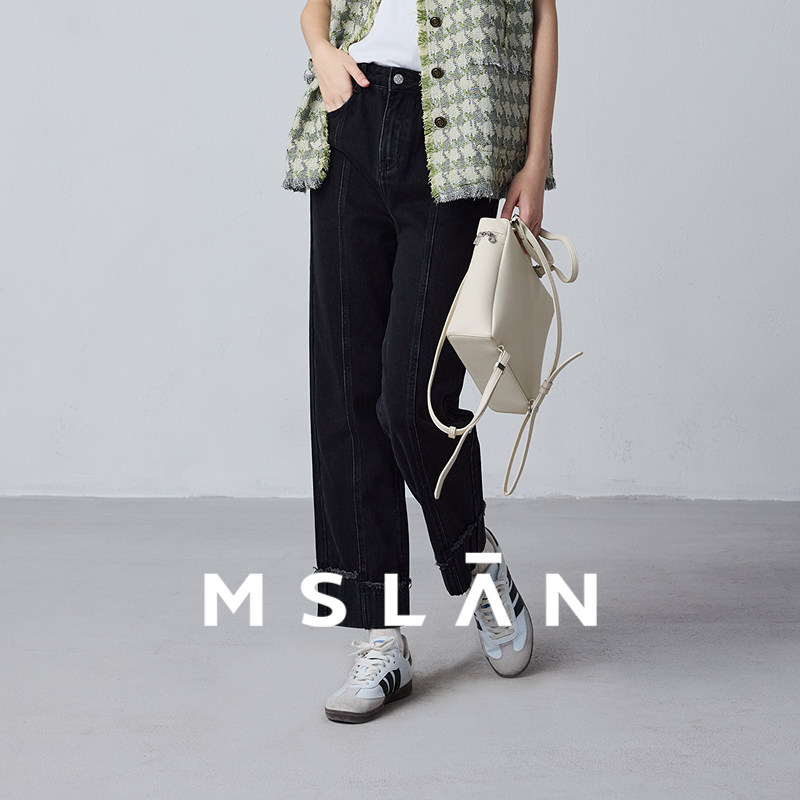 翻折边法棍裤/MSLAN老钱风牛仔裤 秋季复古九分裤卷边高腰牛仔裤