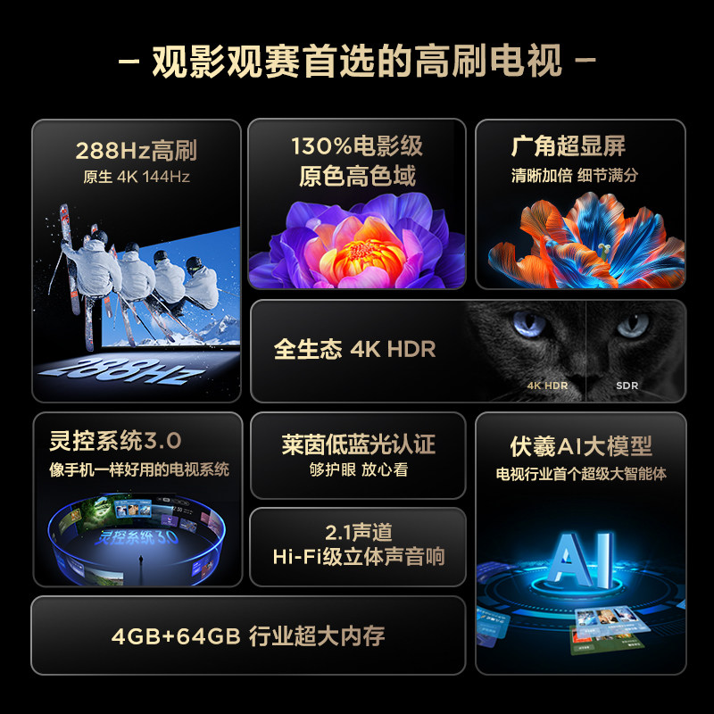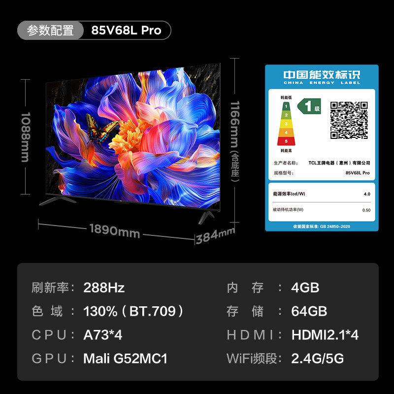 TCL 85V68L Pro 85英寸 288Hz高刷高色域4GB+64GB大内存电视机