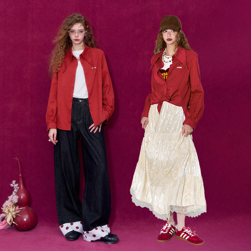 妖精的口袋尖领红色桃皮绒衬衫外套女2026年早春新款甜美百搭上衣
