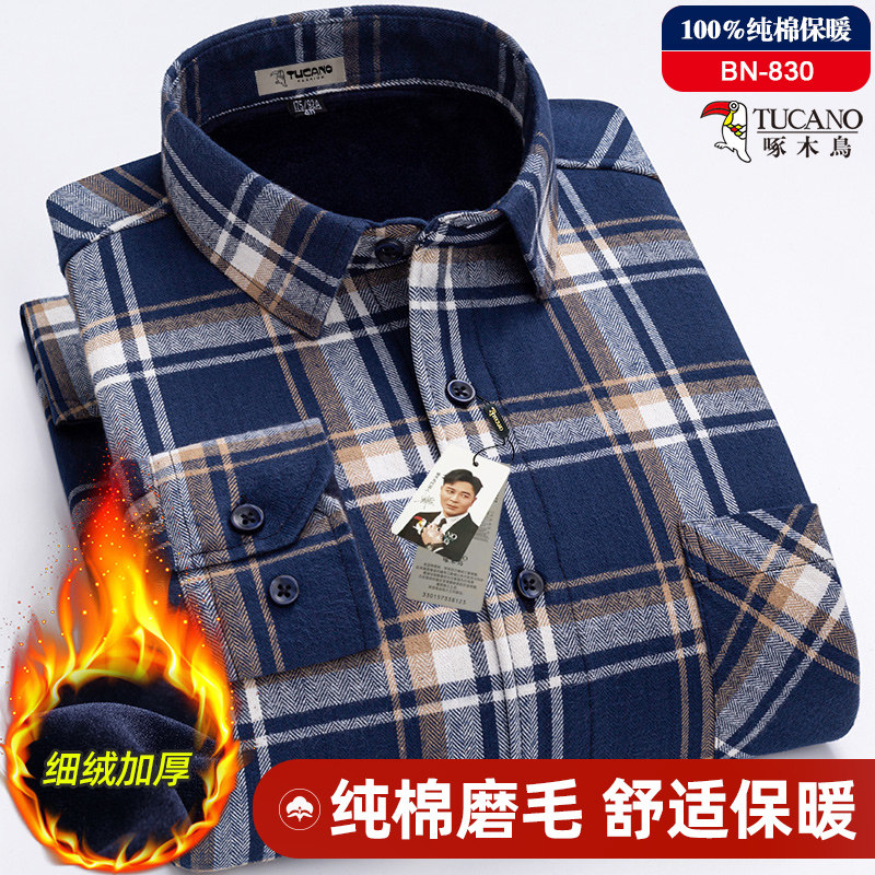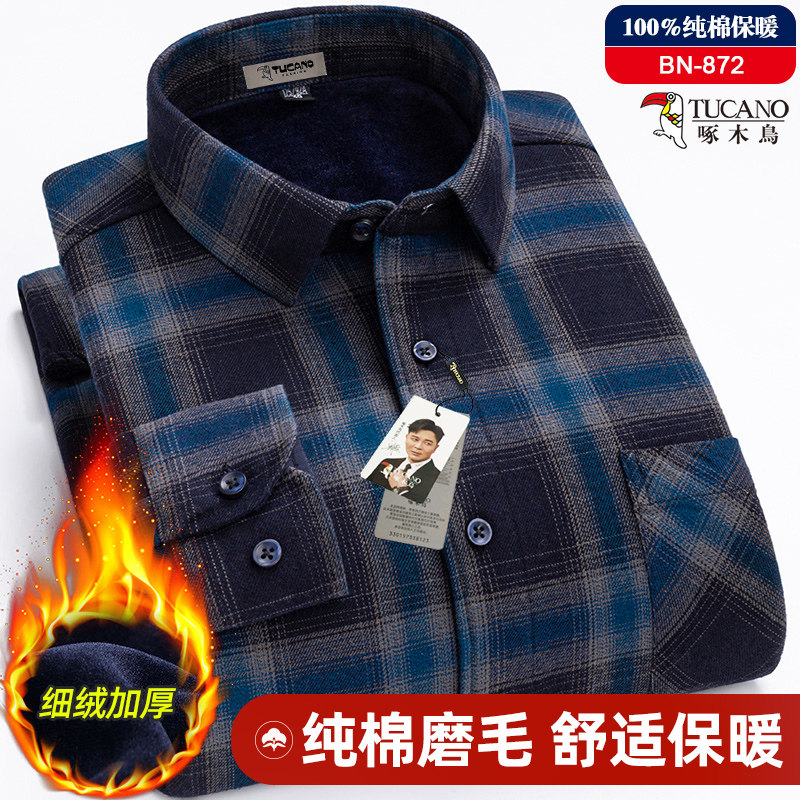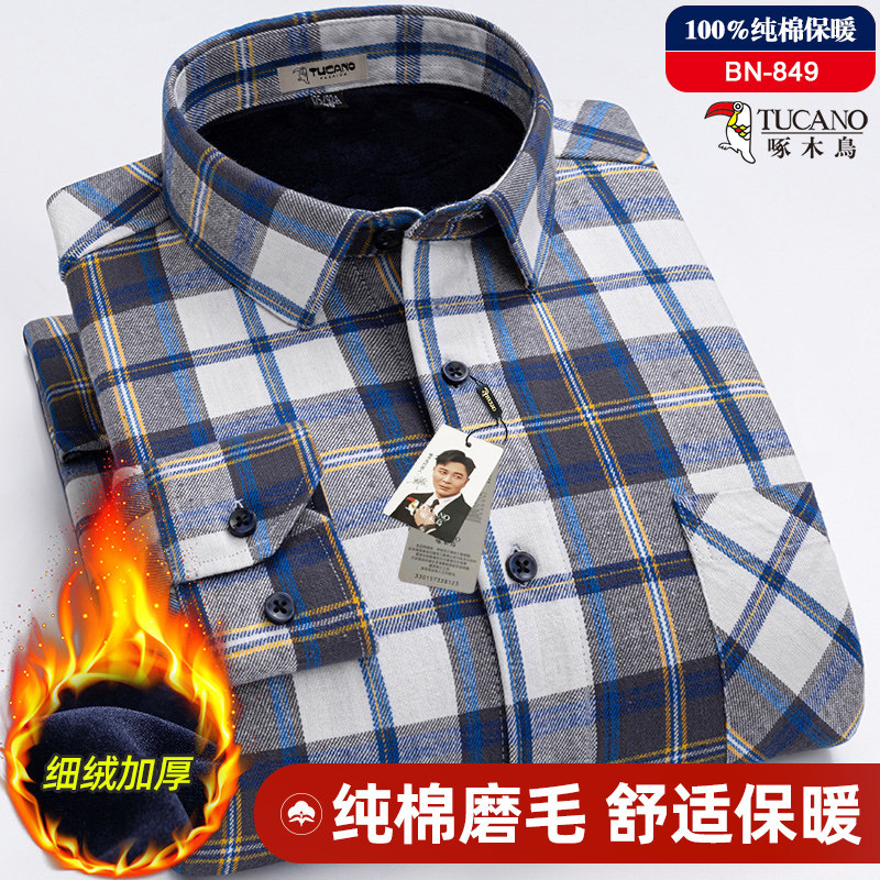 啄木鸟男士本命年红色100%纯棉保暖长袖衬衫冬季加绒中年格子衬衣