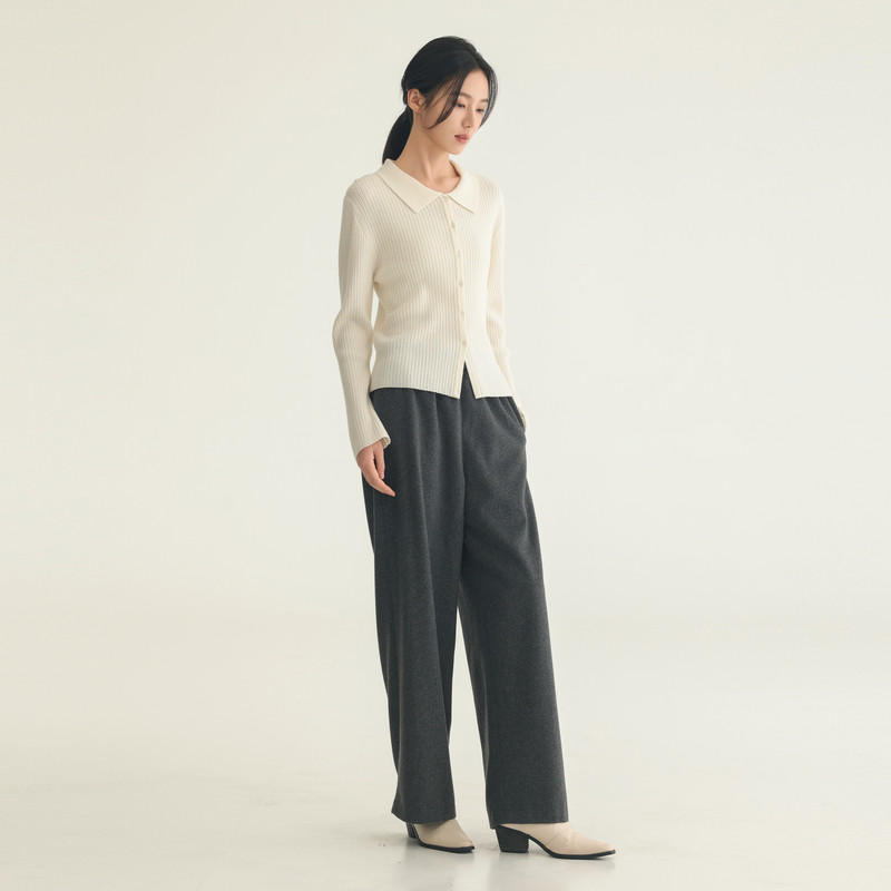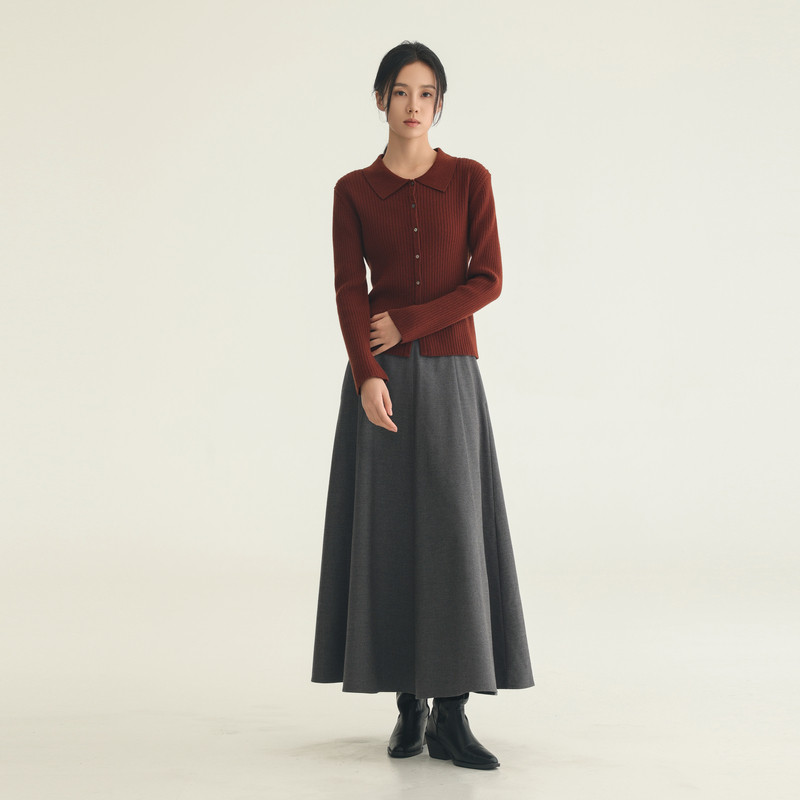 AIRIQI冬季新款简约翻领细坑条羊毛修身长袖针织开衫女AH44KS546