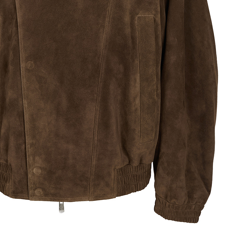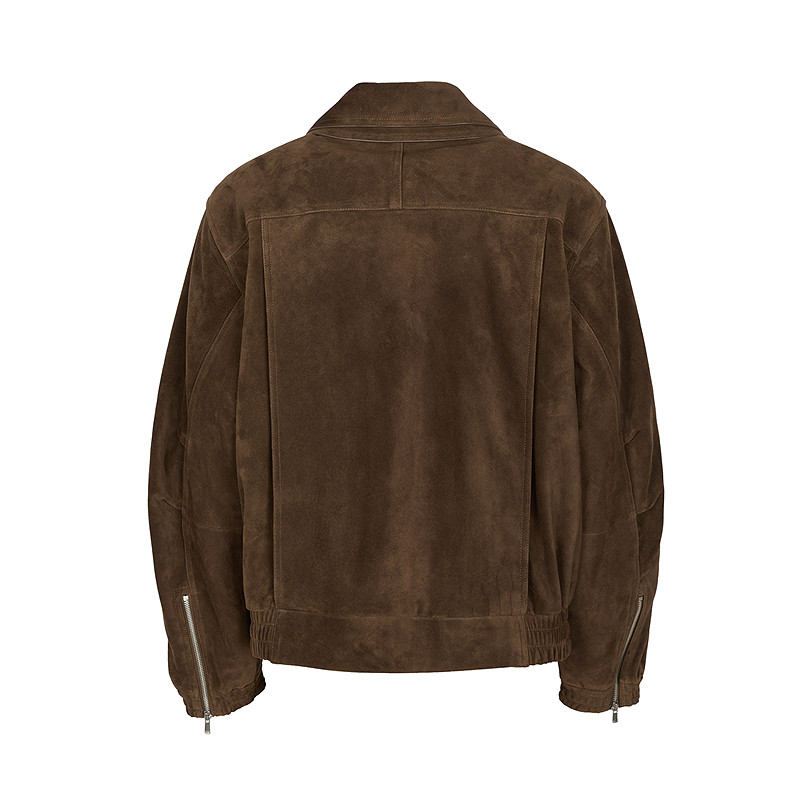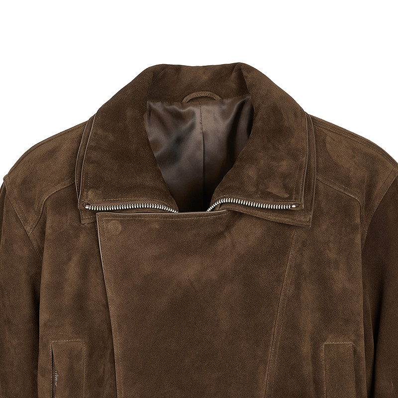 羊皮革绒面皮上身挺括,宽松翻领修饰身型
