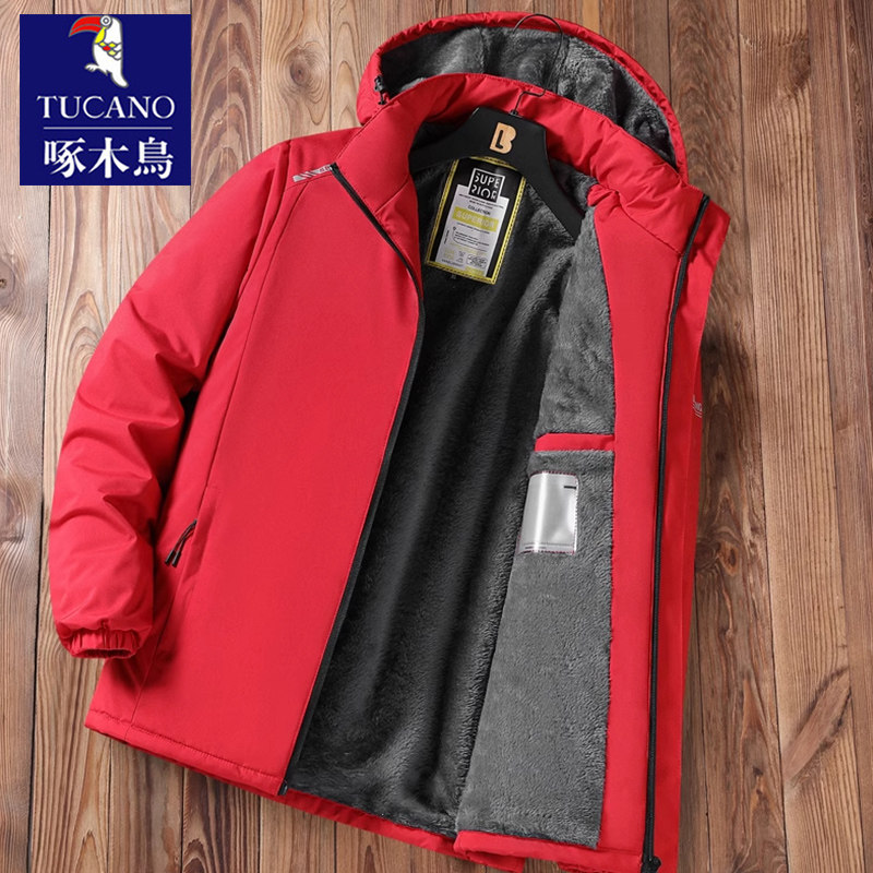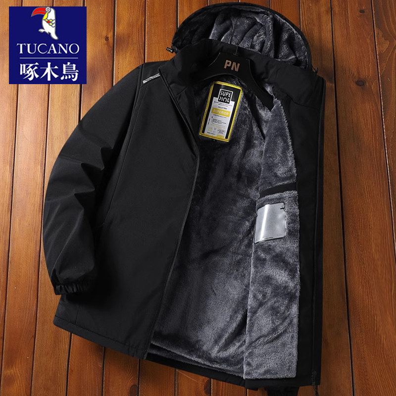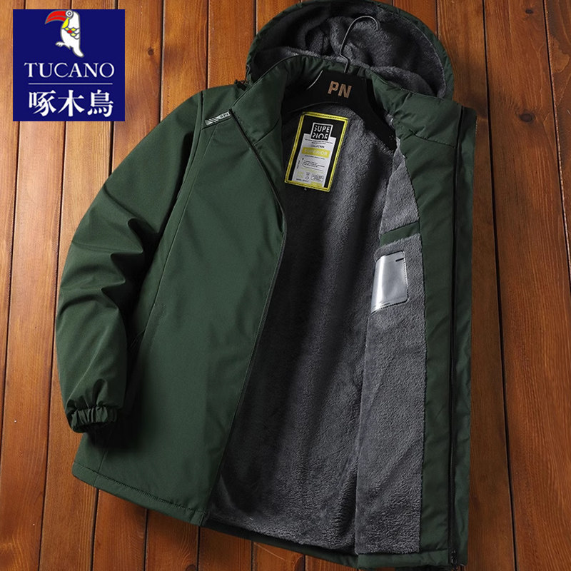 啄木鸟冲锋衣夹克外套男士加绒加厚冬季连帽工装棉服保暖防风棉衣