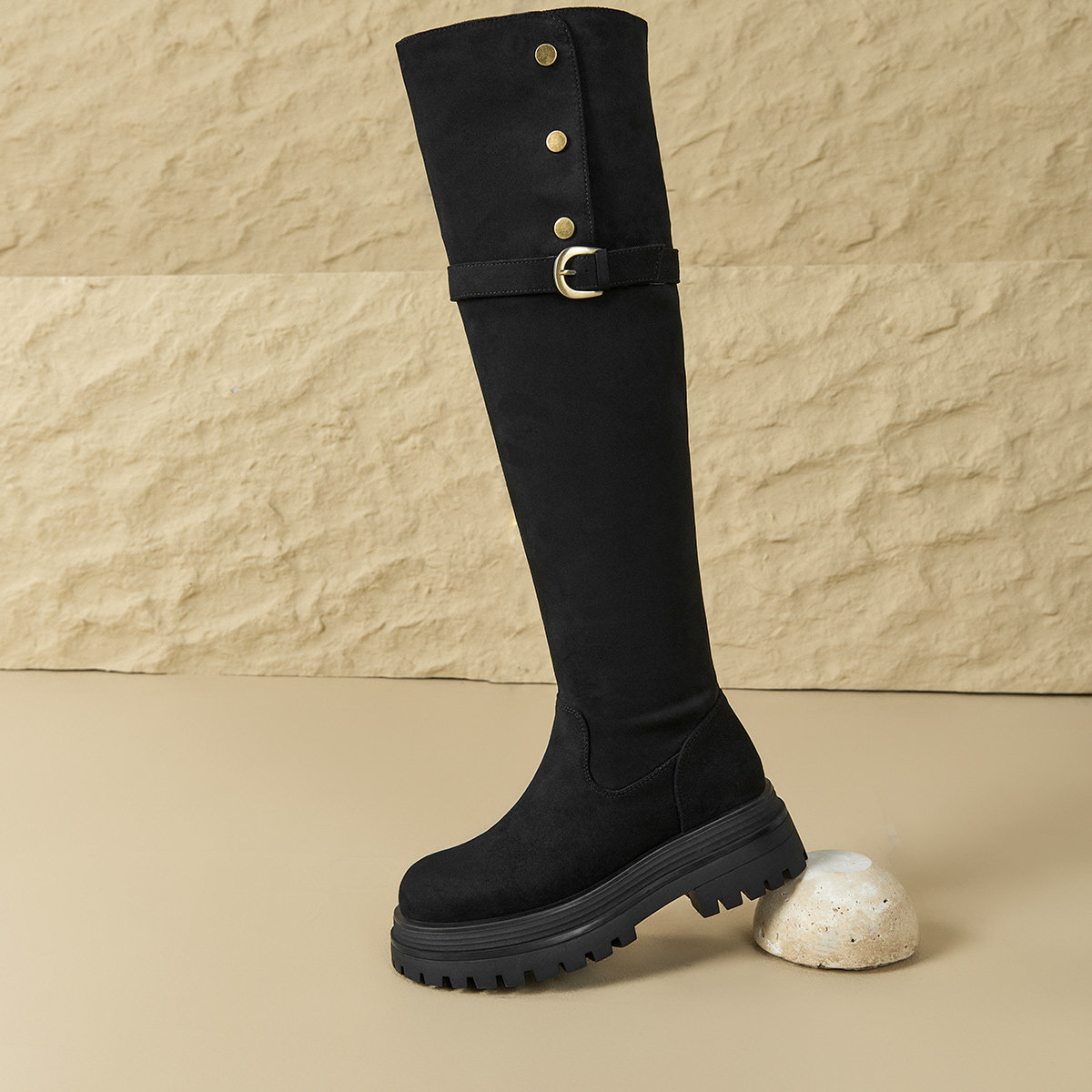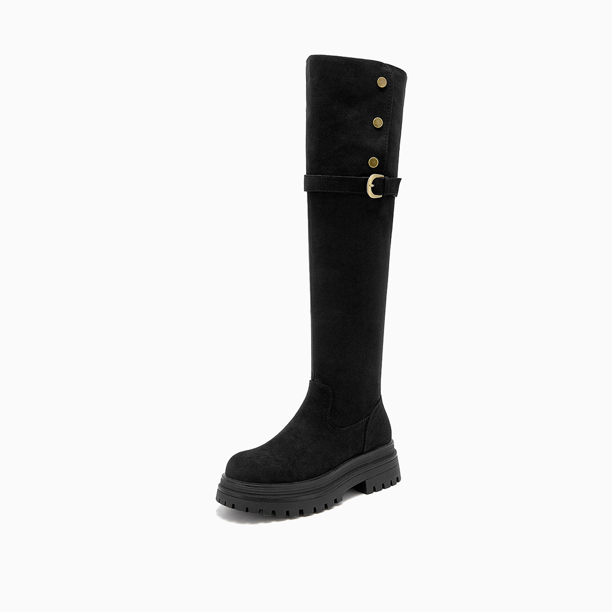 Rongshanyue甄选牛皮粗跟长筒靴套筒皮带扣厚底秋冬靴子B1429
