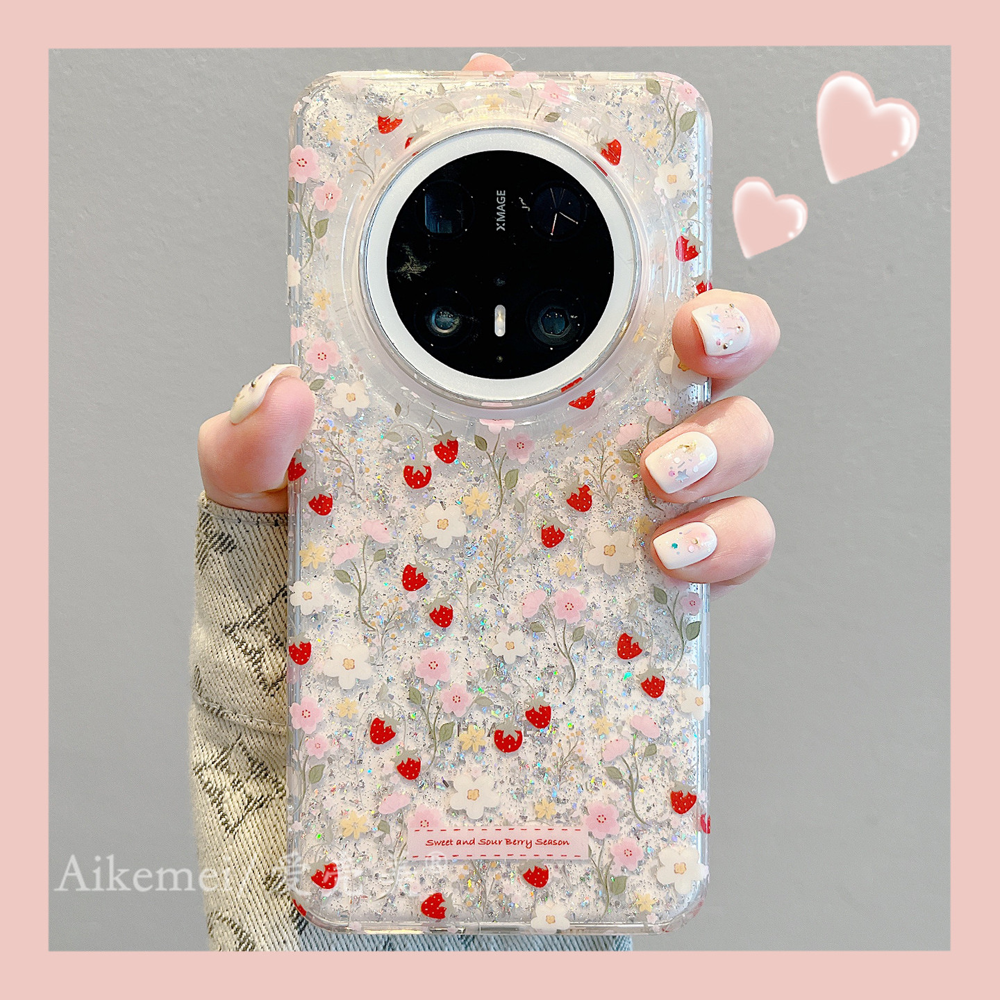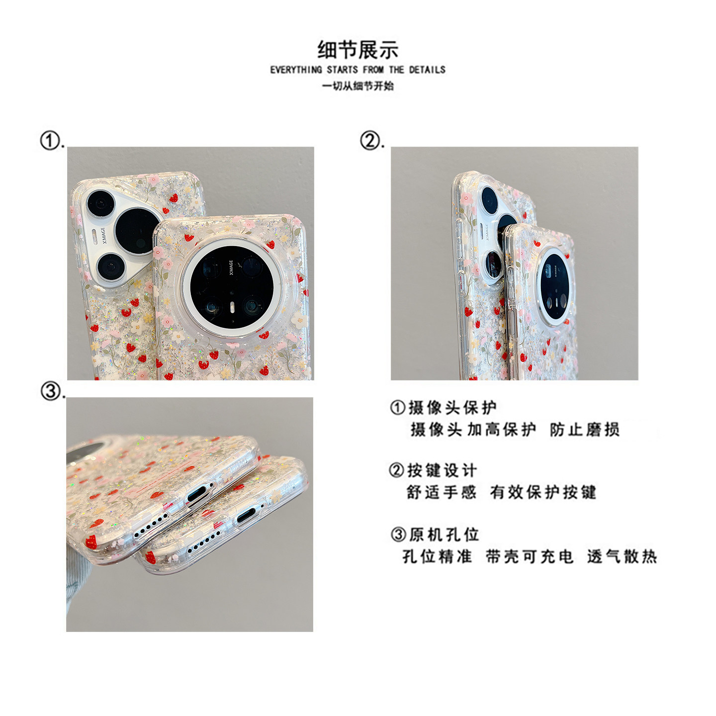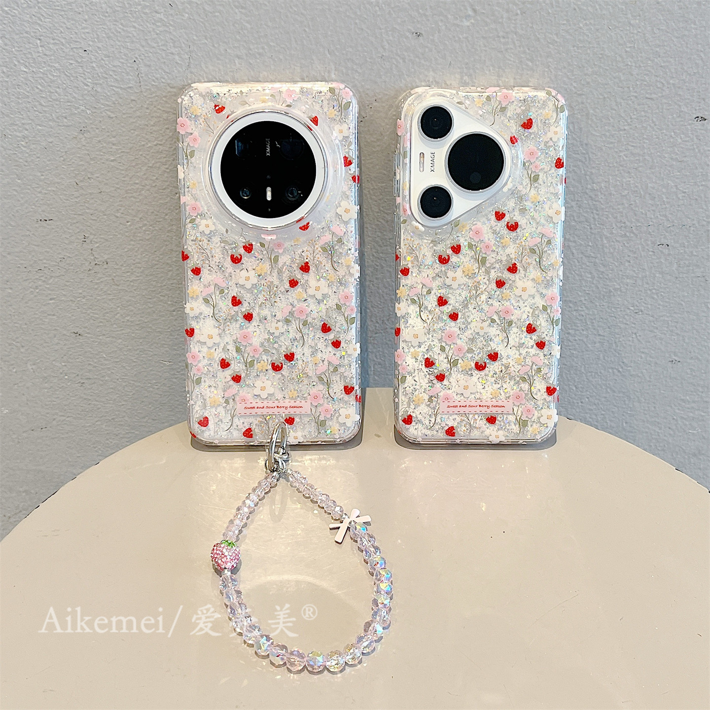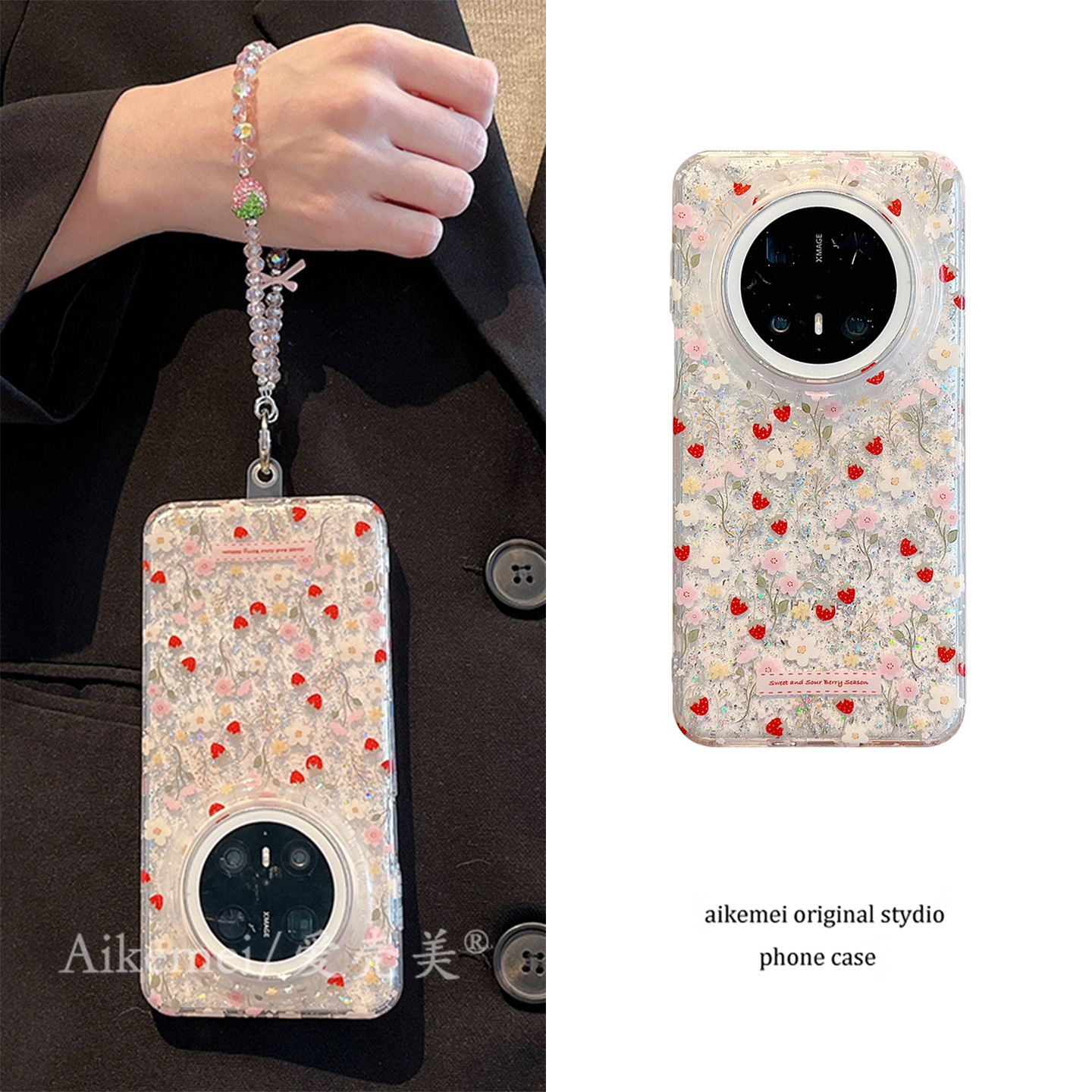 适用华为mate80promax手机壳日韩ins闪粉彩色花朵草莓mate70pro链条挂绳mate60pro新款双层Pura70pro防摔女款