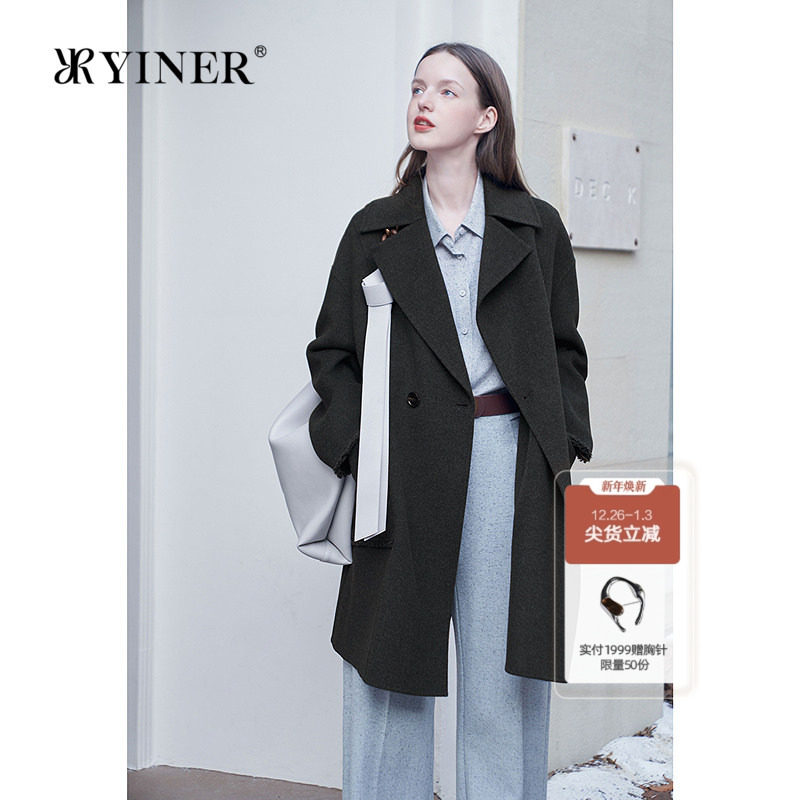 YINER音儿专选2025冬季新款中长款羊毛羊绒混纺双面呢大衣外套