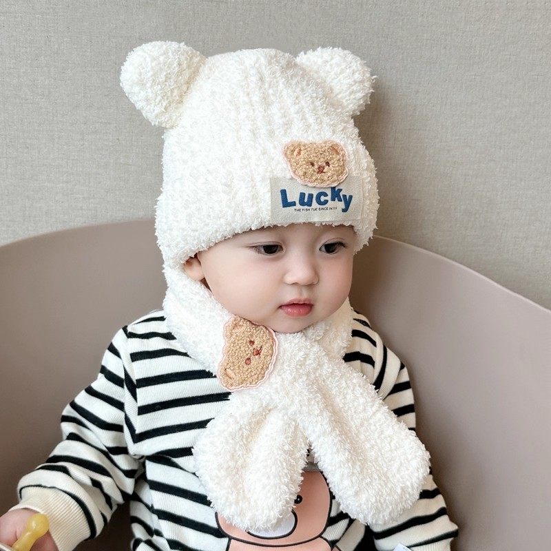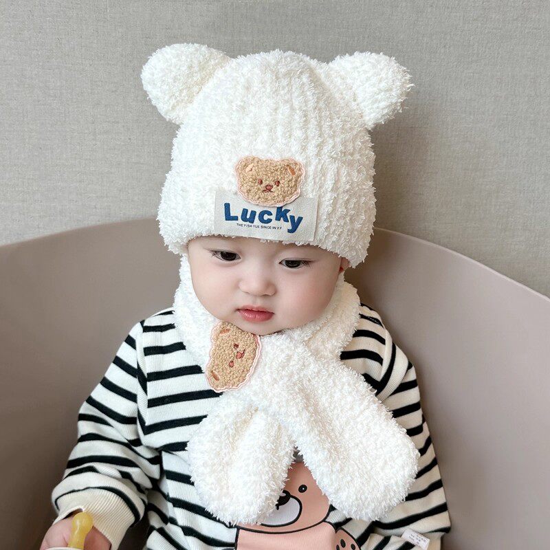 婴儿帽子秋冬季保暖围巾两件套宝宝加厚毛绒套头帽男女童针织白色
