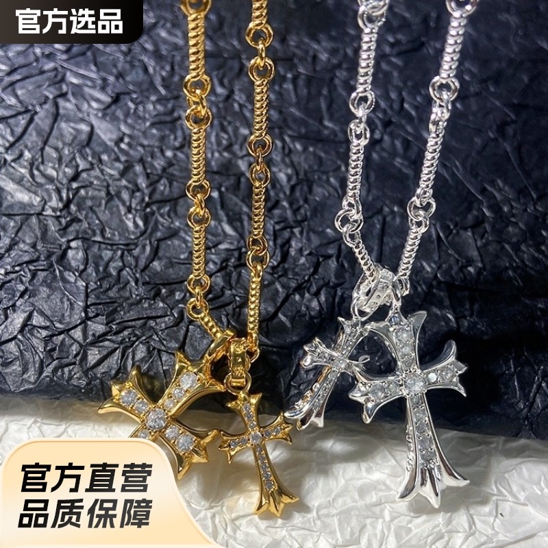 克罗伈十字架双吊项链颈链欧美情侣彩钻男女吊坠饰品复古铜